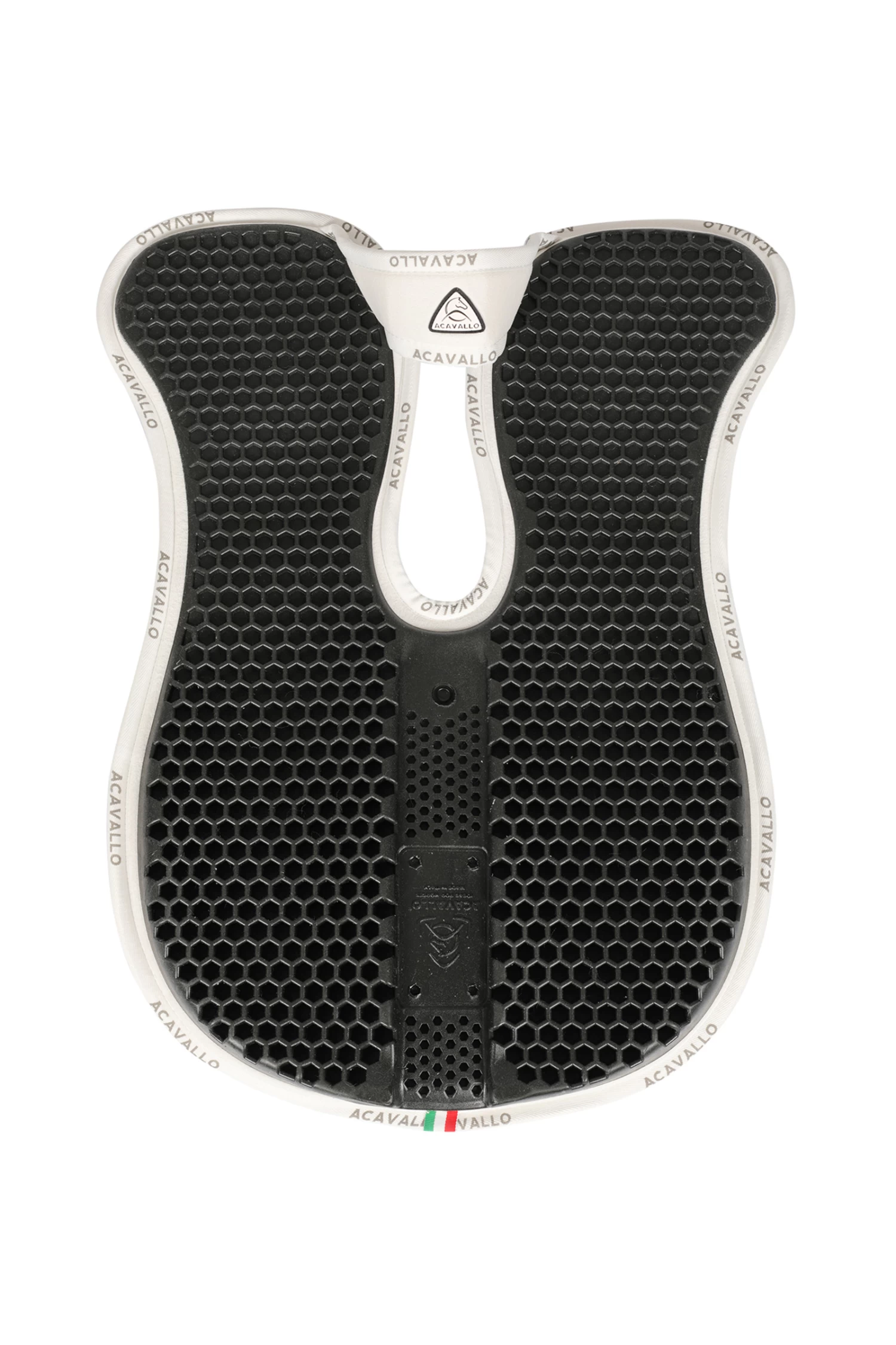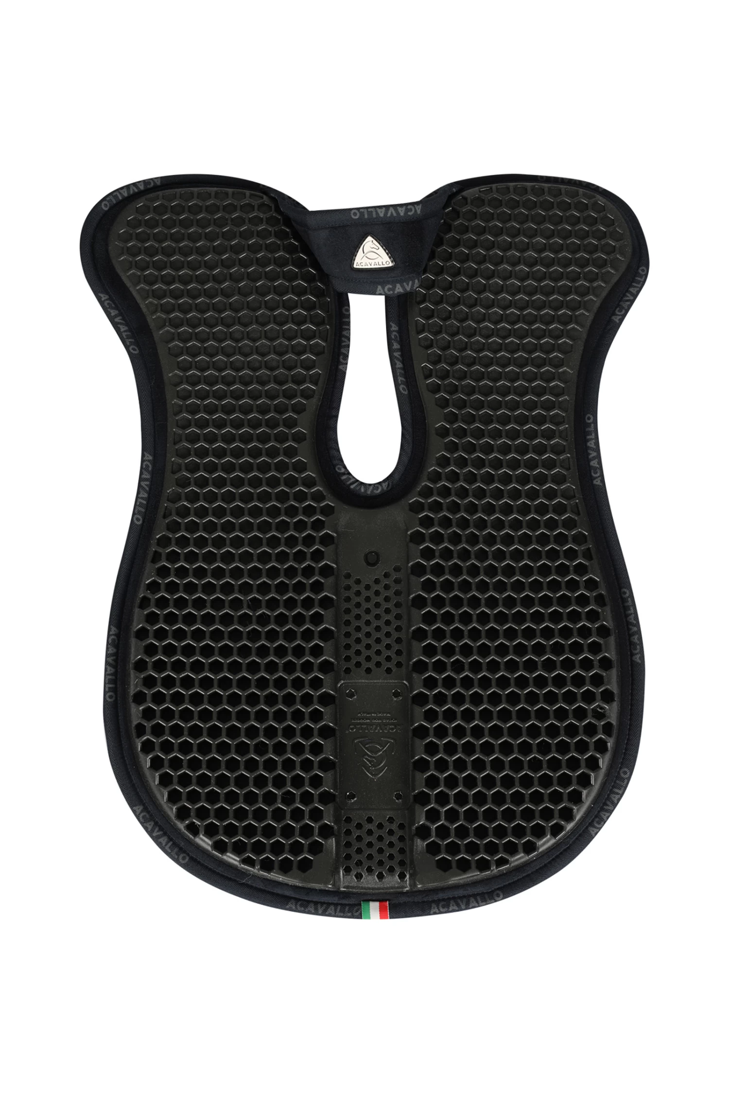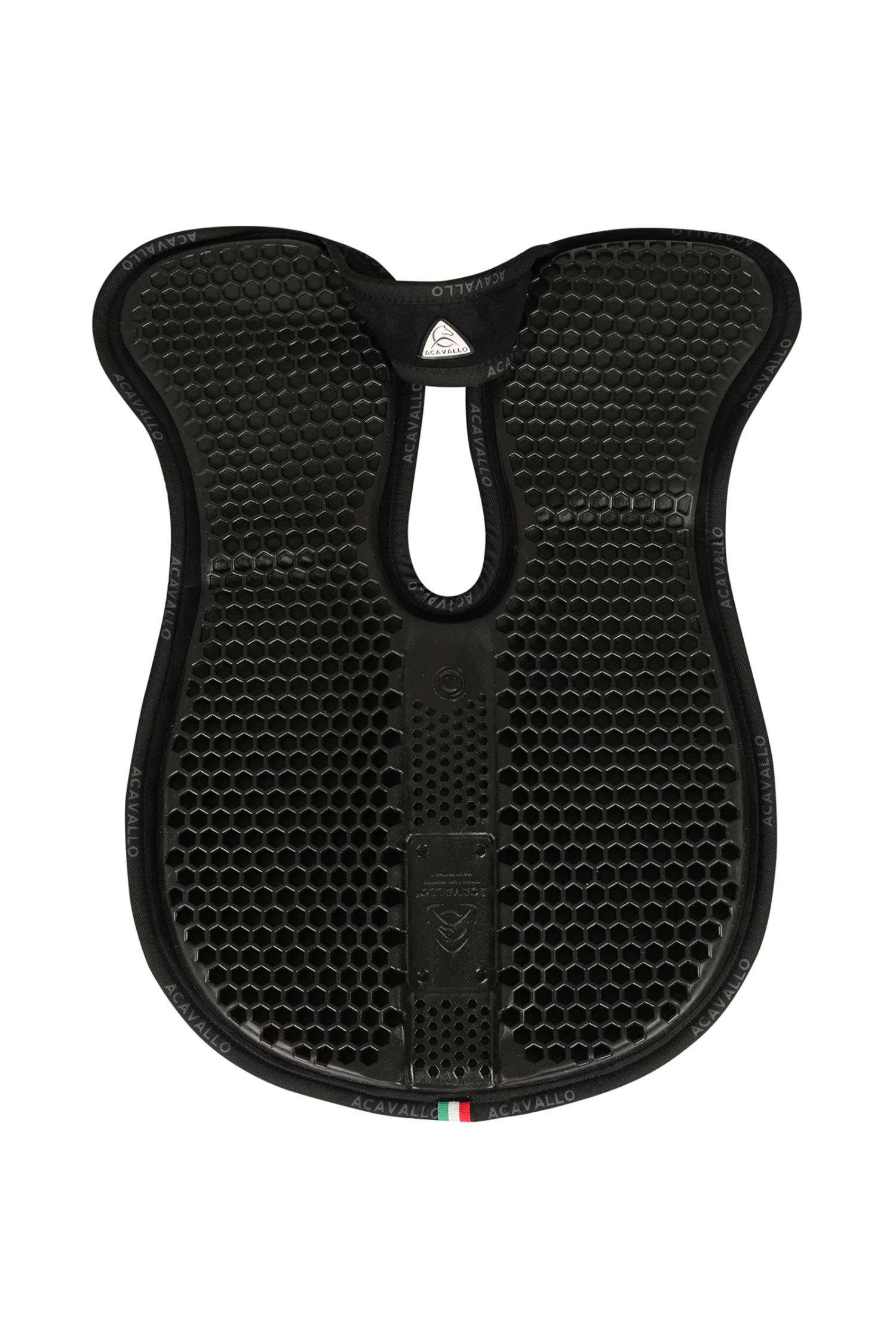 The Acavallo Withers Free Hexagonal gel pad in memory foam with back riser does not compress the withers, helps to prevent problems by distributing weight evenly. Anti-slip, shock absorbing hexagonal gel pad properties are combined with the shock absorbing properties of the memory foam and with a rear riser. Because of its hexagonal gel structure, air is compressed within the cells of this non-slip pad and is expelled as the horse moves creating a cushion under the saddle. Designed to fit under any style and size of English saddles. It is shaped and moulded to the saddle with a slightly thinner depth of gel running down the centre of the pad allowing the gel to sit up in the gullet. The anatomic cut of the pad and the technical characteristics of the memory foam allows the pad to adapt and shape itself deeply to the silhouette of the horse, also allowing the surface pressure to be distributed over a large area. To these features are added the ability to absorb shocks, dampen vibrations and regulate the horse’s body temperature. The Acavallo® Classic Gel is hypoallergenic, non-toxic and does not react negatively in contact with the skin, characteristics that allow the pad to be used directly in contact with it.