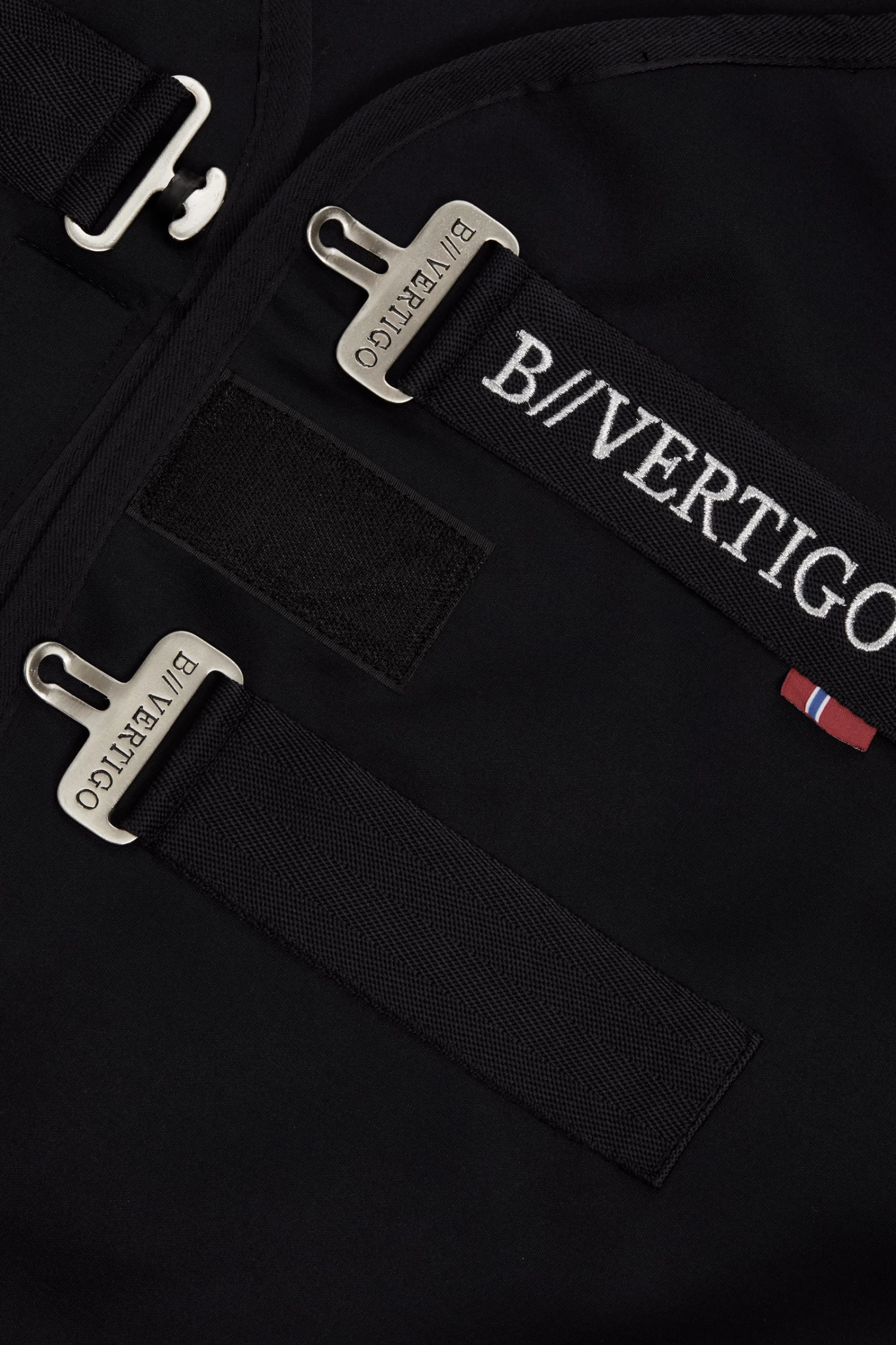 The B Vertigo Drew rug is made from durable, flexible scuba material that will keep your horse warm during transport or in the stables. The smooth surface keeps shavings and dust away. X-surcingles, double t-buckles and tail cord keep this rug in place. The lazer cut logo detail adds a cool touch.
