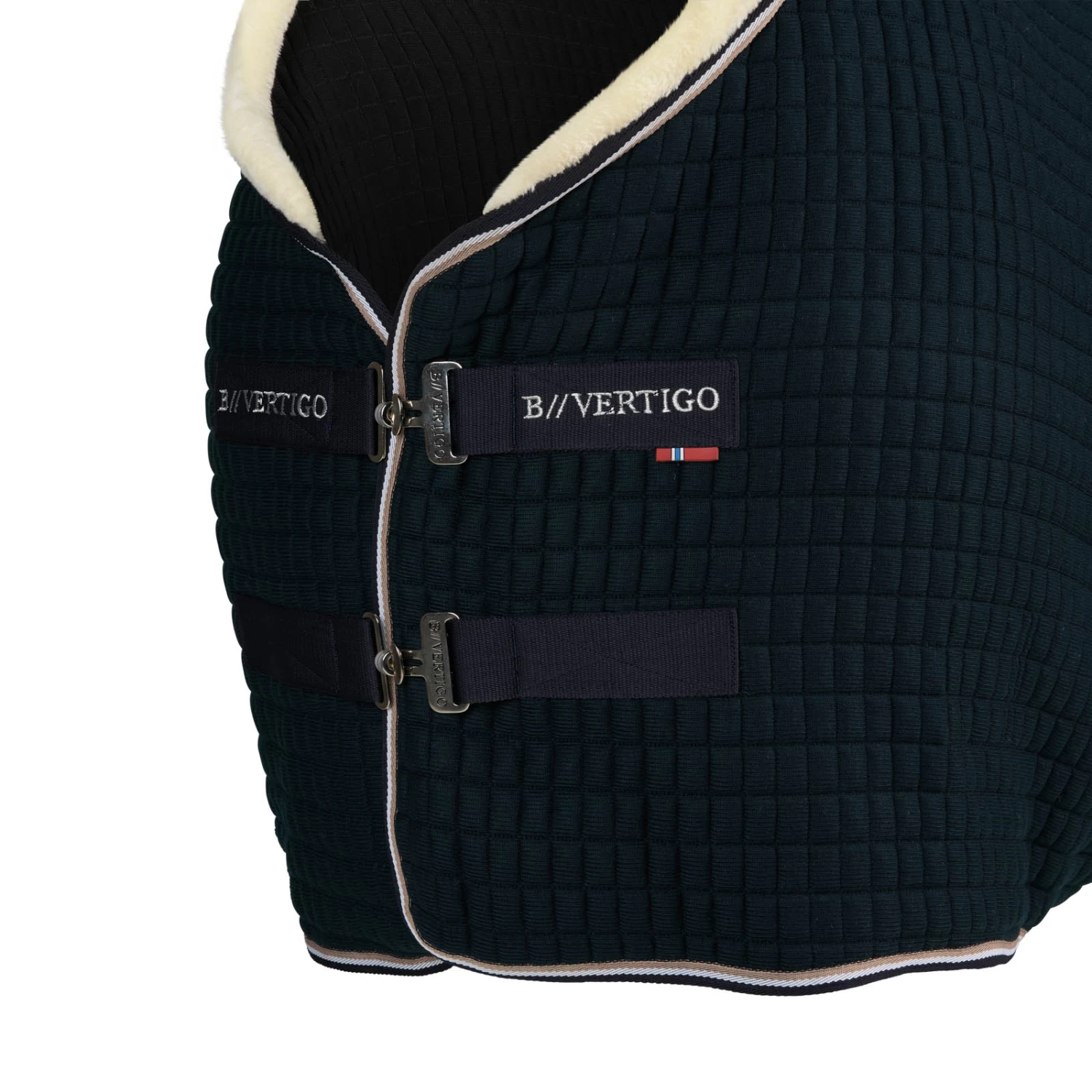 The B Vertigo Dylan rug is designed with a soft faux fur collar to add warmth and comfort. Square quilting stores the temperature perfectly. T-buckles in the front open and close safely, and X-surcingles and tail cord keep the rug in place. B Vertigo embroidery adds another elegant feature.