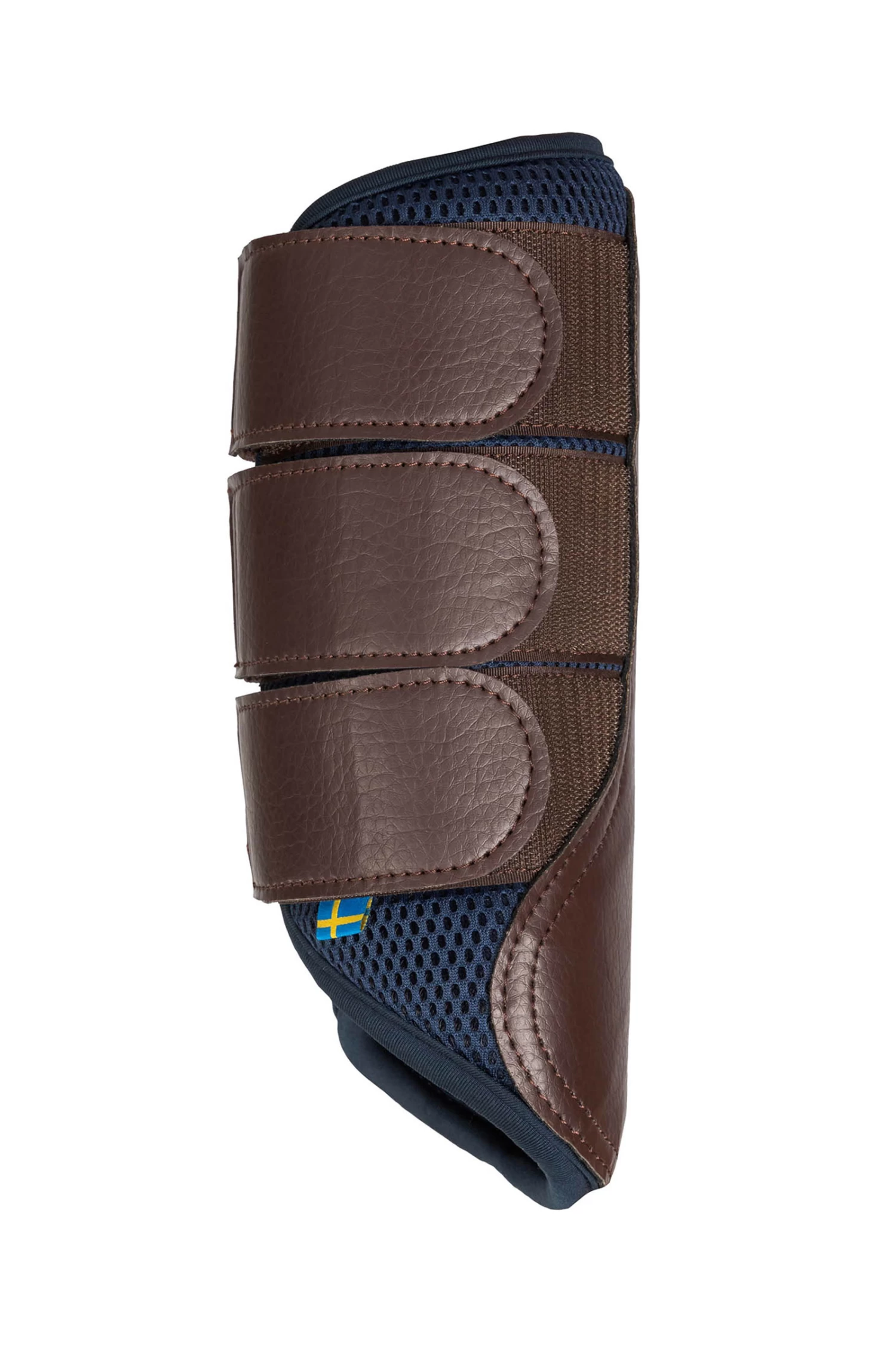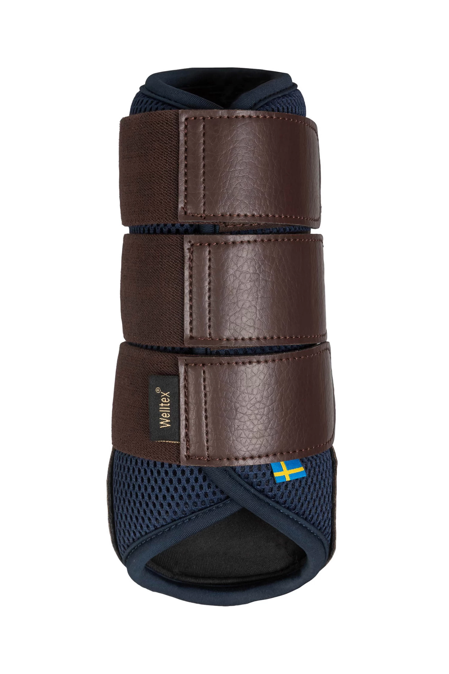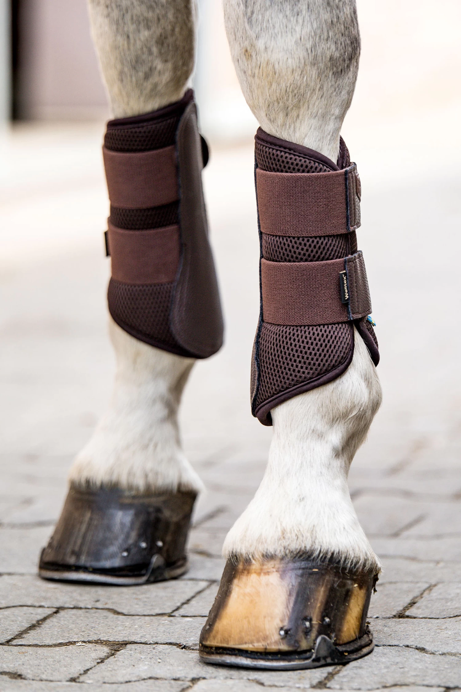Flexible brush boots in 3D Mesh, with a shock-absorbent and pressure distributing padding to protect the horse’s legs from impact and injury. Highly breathable to prevent over-heating. Strong and reinforced hook-and-loop fasteners provide a comfortable fit. Stylish design with artificial leather over the reinforced zone and the end of the straps. The inside has a Welltex® infused lining to give your horse the best conditions for both performance and recovery. This technology may stimulate blood flow in the area by reflecting far infrared energy and can support the tendons and joints. These all-purpose and easy-to-use boots are suitable for both front and hind legs. To get the best fit, we recommend going up a size for the hind legs.