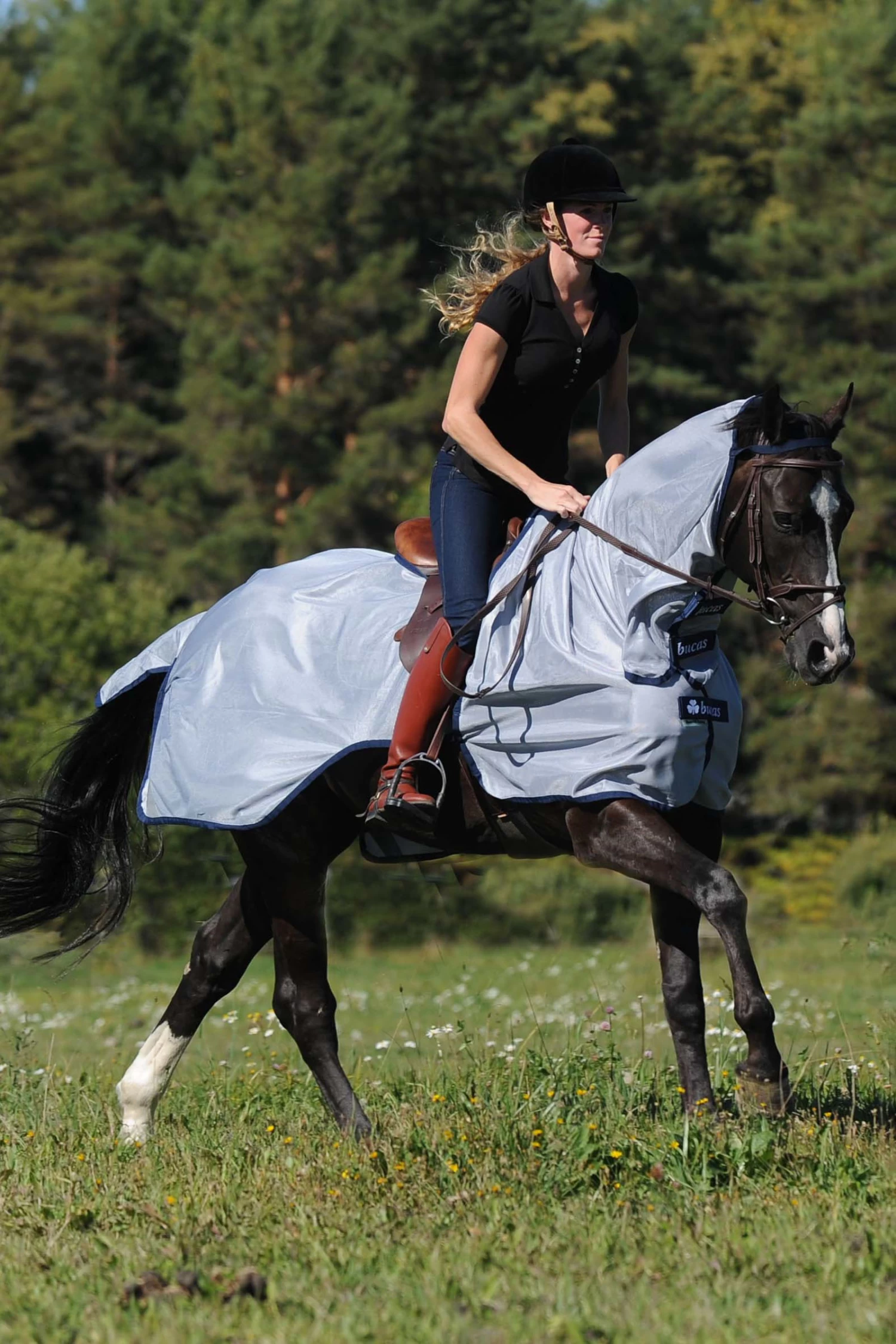 The Bucas Buzz-off range consists of a very fine mesh fabric that offers UV protection and keeps even the smallest insects away. In addition, the products are extremely lightweight and reflect heat, guaranteeing maximum comfort for the horse even on particularly hot days. The large tail flap also covers the dock sufficiently.The Buzz-Off Riding is a two-piece riding rug with a removable neck piece and thus protects the whole horse or a partial area, depending on the requirements. The neck piece covers the horse’s neck, chest and shoulders. It is attached to the head with an elastic headband and to the saddle with loops. The rear part of the rug is cut like a quarter sheet and has a cut-out for the saddle.