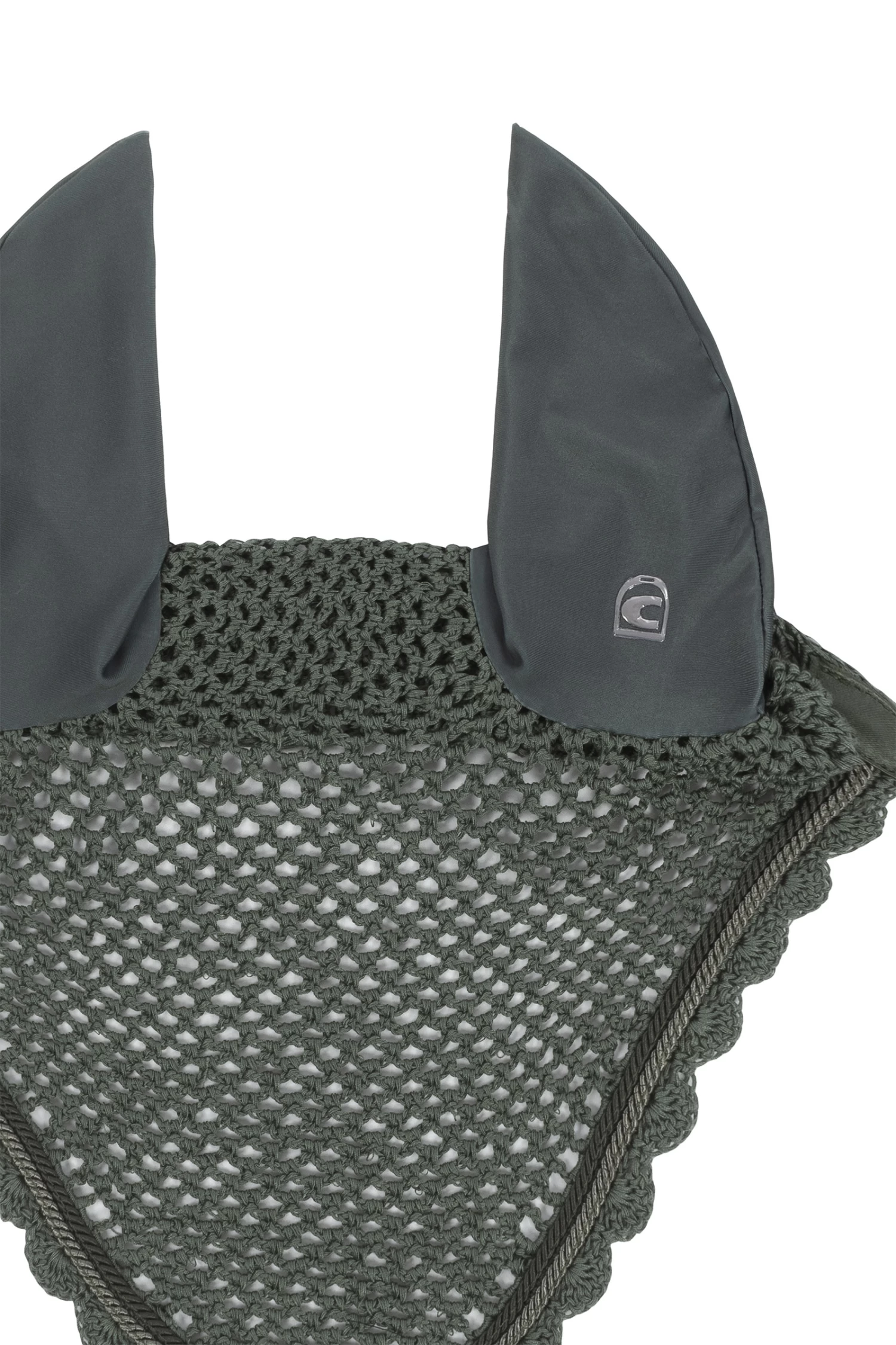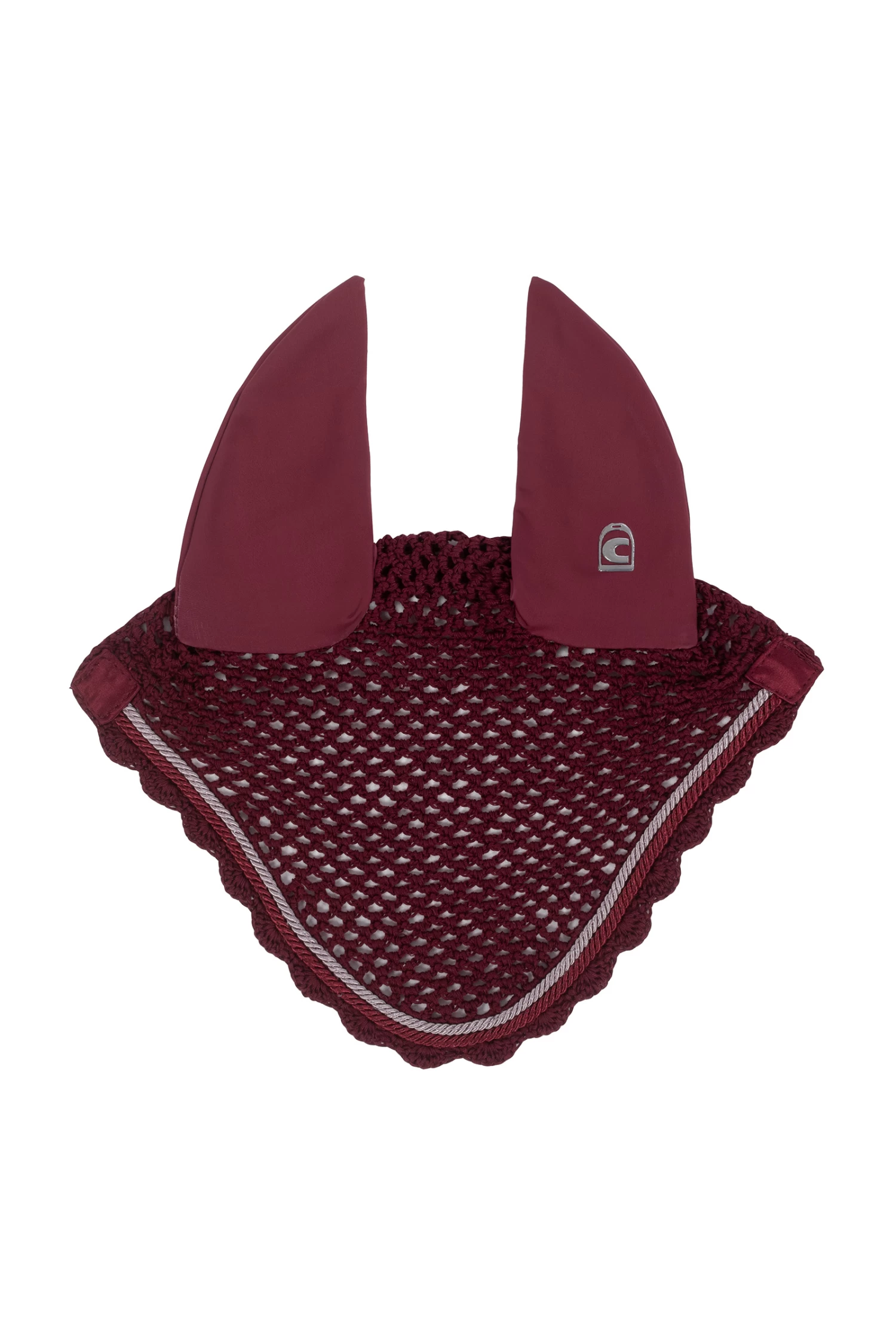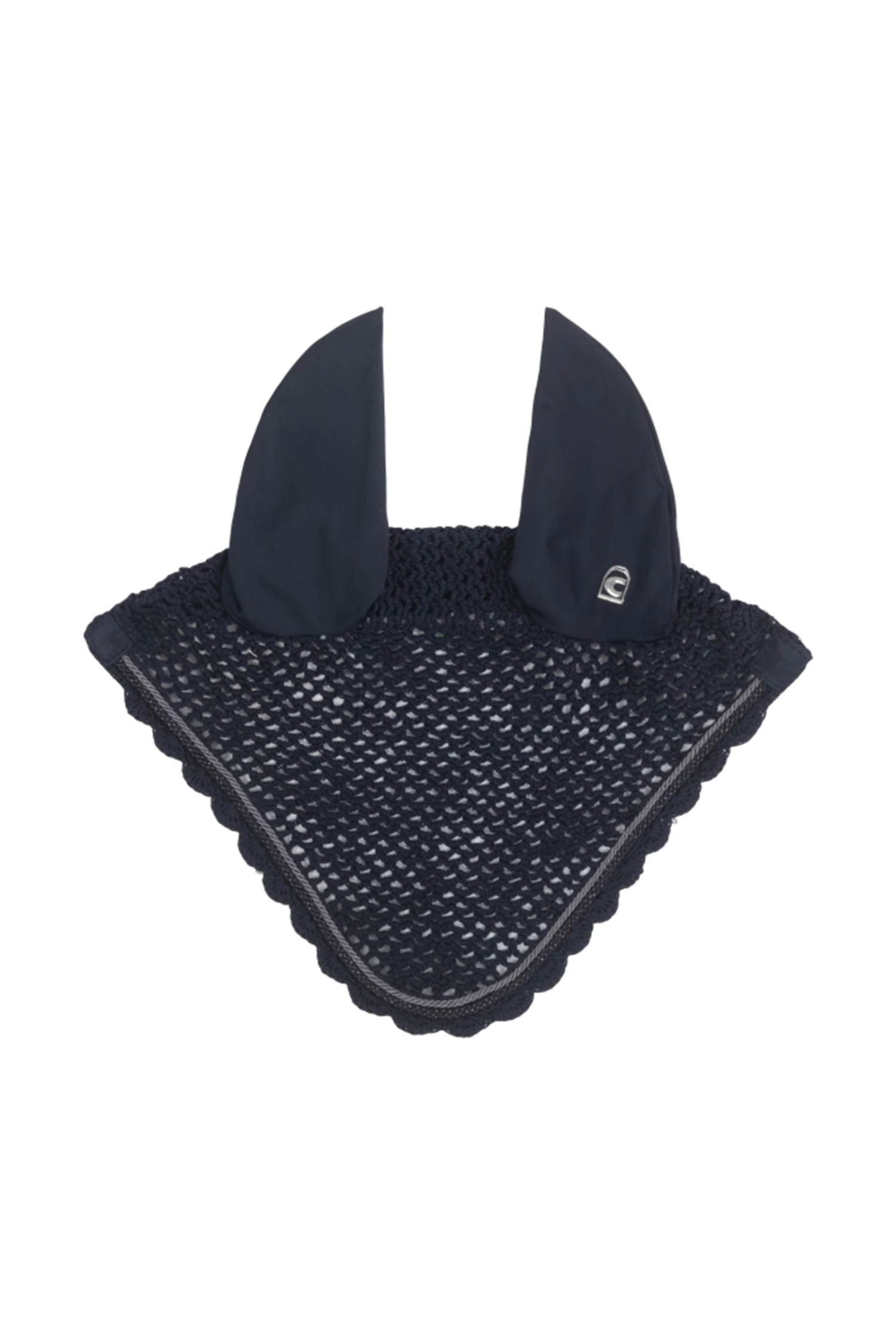 The left ear is printed with the Cavallo stirrup logo. Head cover in crochet look. Two small, contrasting coloured cords frame the fly hood.