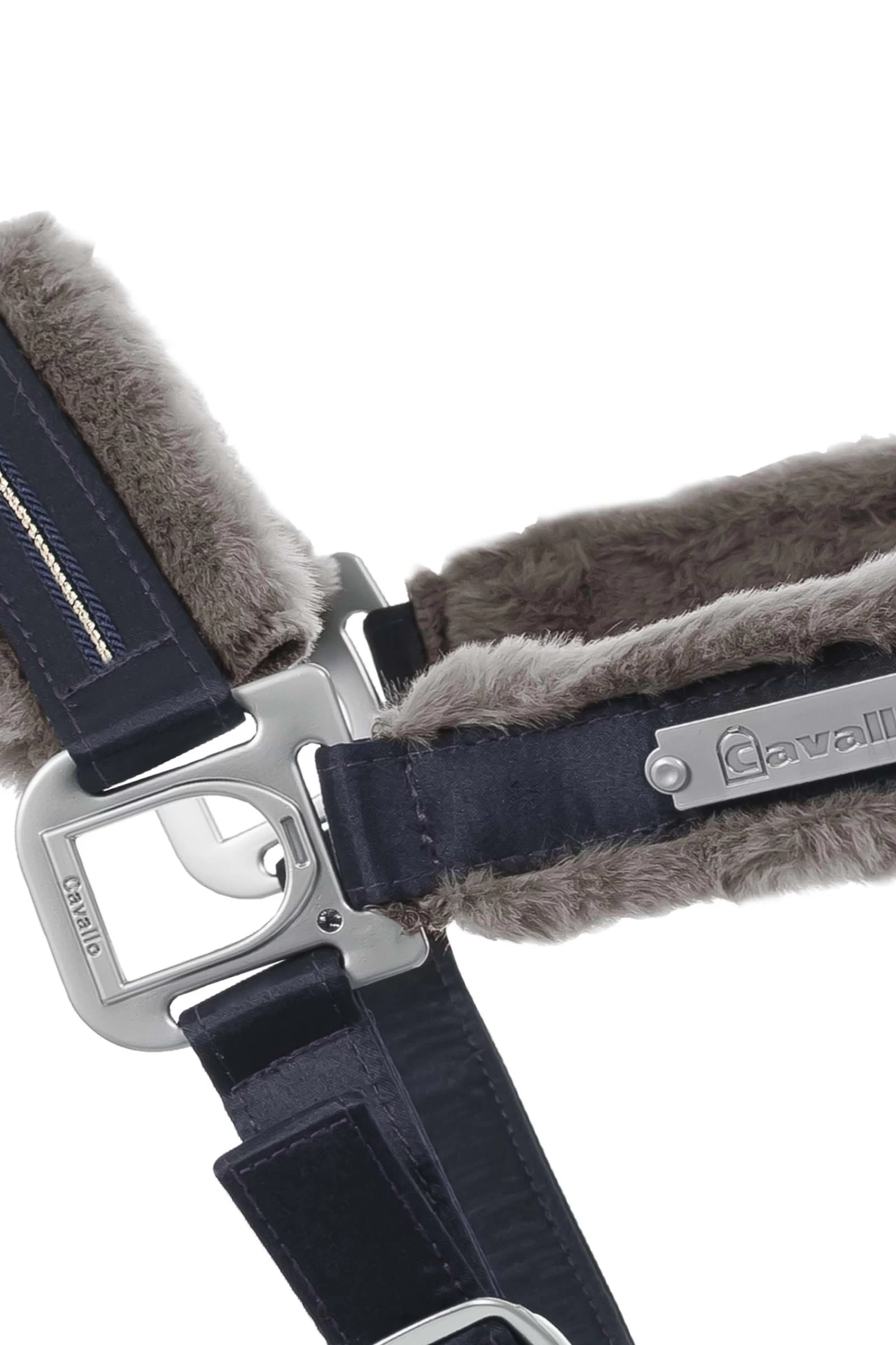 Comfortable padding on nose, cheeks and neck. All metal parts in dull silver. Halter buckles with Cavallo logo and shiny rhinestones. Noseband and neck adjustable due to pin buckles. The noseband has two tonal cords framing a black tape with shimmering gold threads The cheek pieces are finished with silver dull plates on which the Cavallo logo is embossed.
