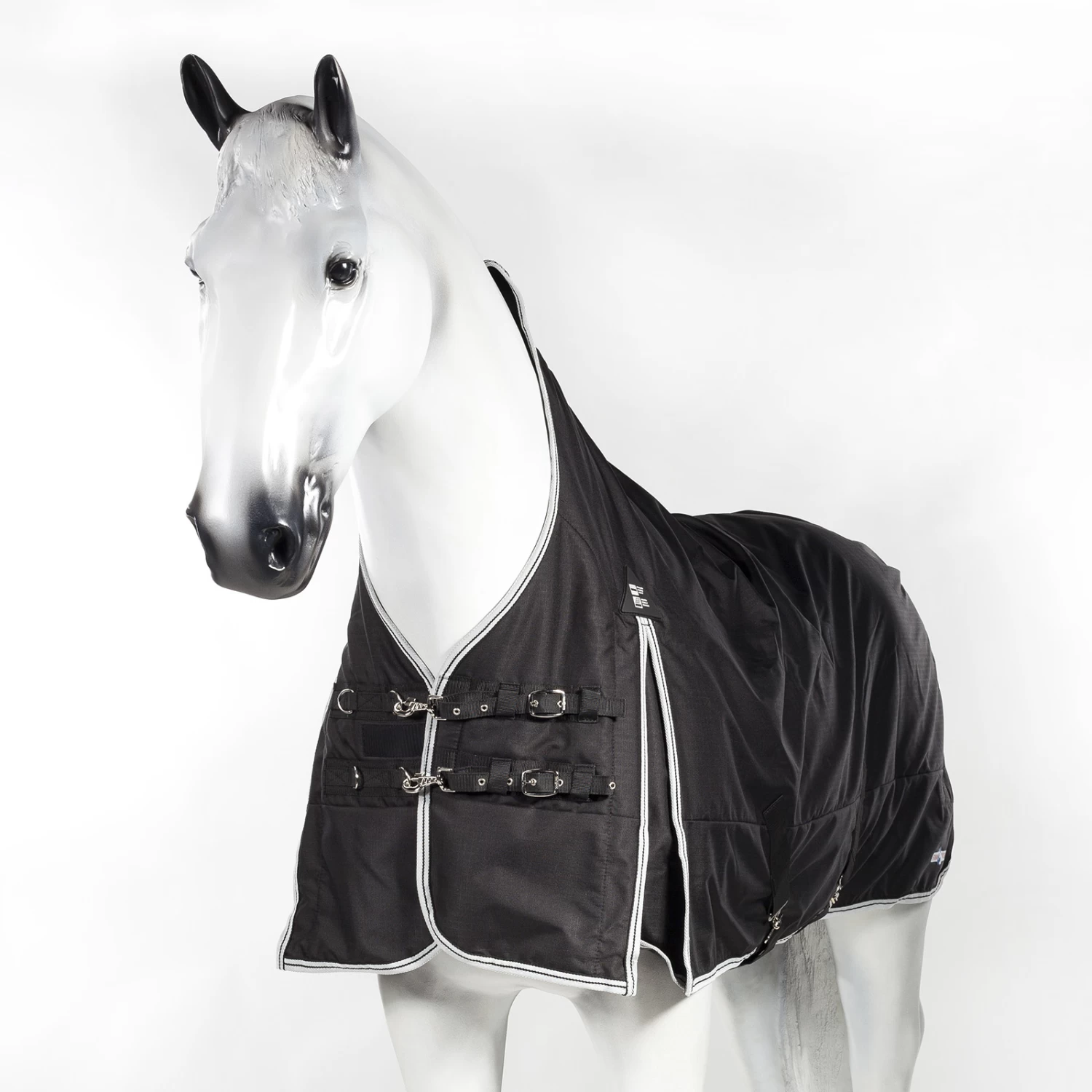 600D polyester rug with polyester lining. Front closure has good adjustability with two snaps for quick fastening both on and off. Comes with x-surcingles, detachable elastic leg straps and tail flap. The high shoulder gussets allow for free movement and less chafing. The fabric maintains waterproof/breathable qualities after many washes.
