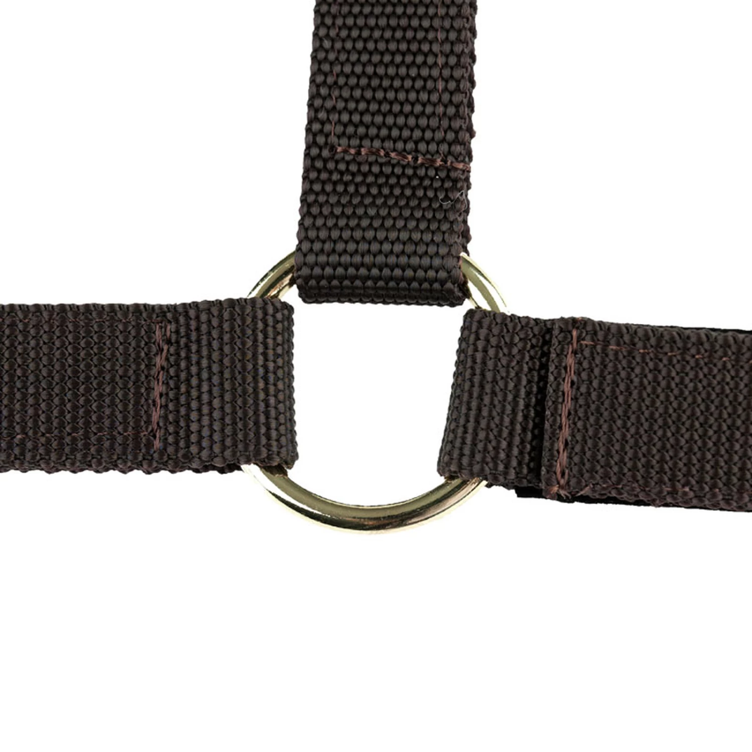 Nylon halter, adjustable at the neck strap and on the nose band. Throat strap has a snap hook. Neck strap and nose band have a suede lining.