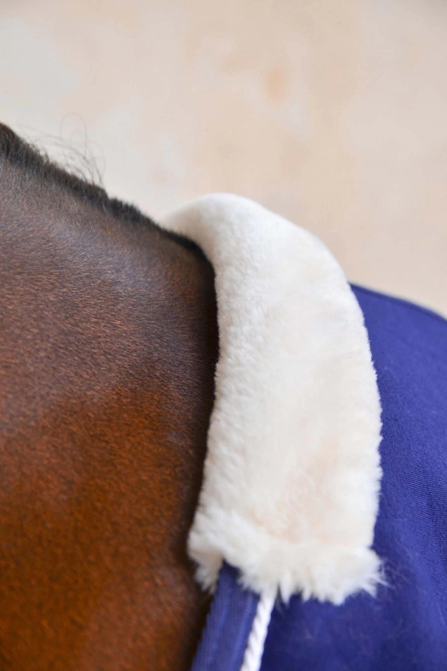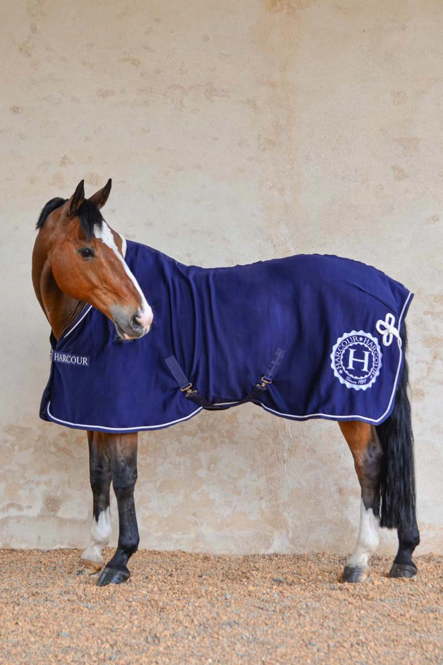 This rug is made from monoface polarfleece. This rug got a braided tail rope, 2 removable belly belts, and closure for horse breast. Fake sheep for withers give a maximum of comfort. This horse rug is perfect to give warmth but also to dry your horse. Its houndstooth flat band, and Harcour embroidered in silver on left side give a very smart look to the horse rug.