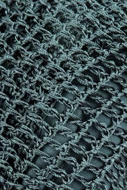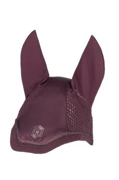 Ear net with neoprene, noise-cancelling earpieces. Crocheted, with plaited decorative cords and contrasting trim.