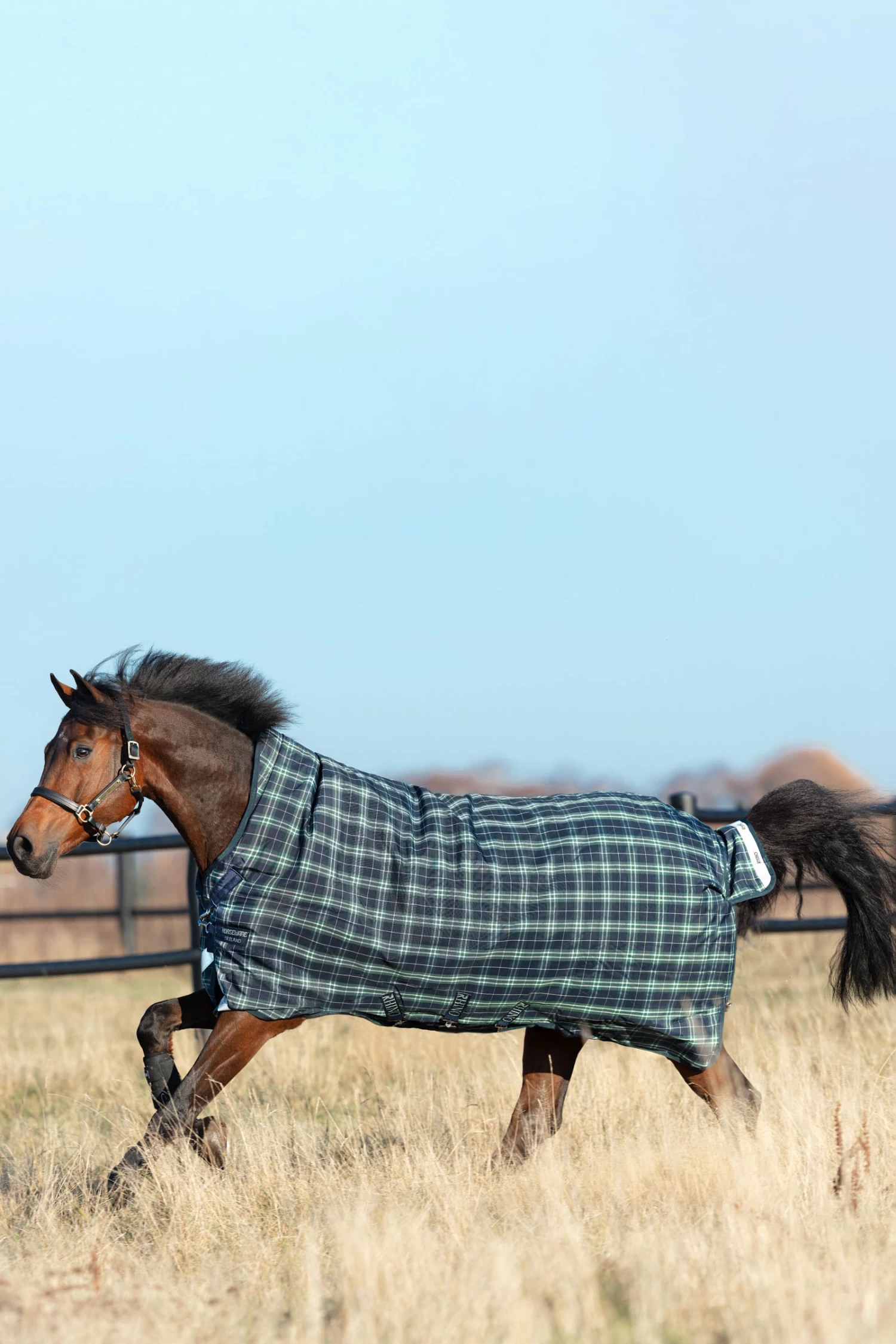 High neck design to give a snug fit and eliminate wither pressure, V-front closure for freedom of movement while grazing, leg arches, shine enhancing polyester lining and cross surcingles.