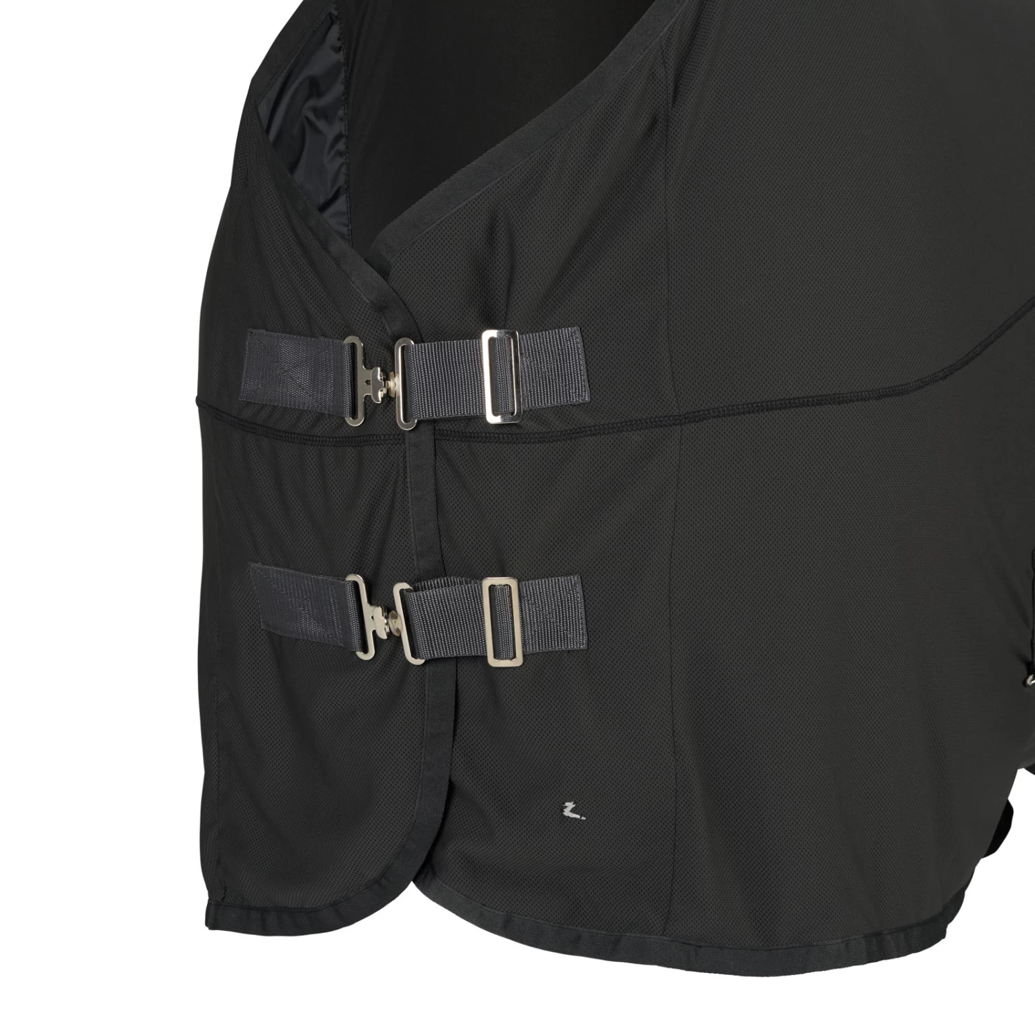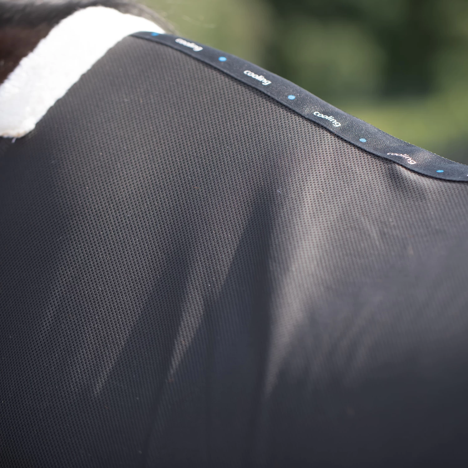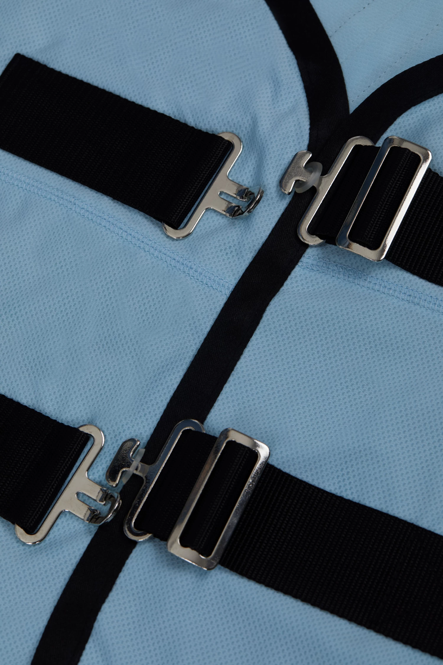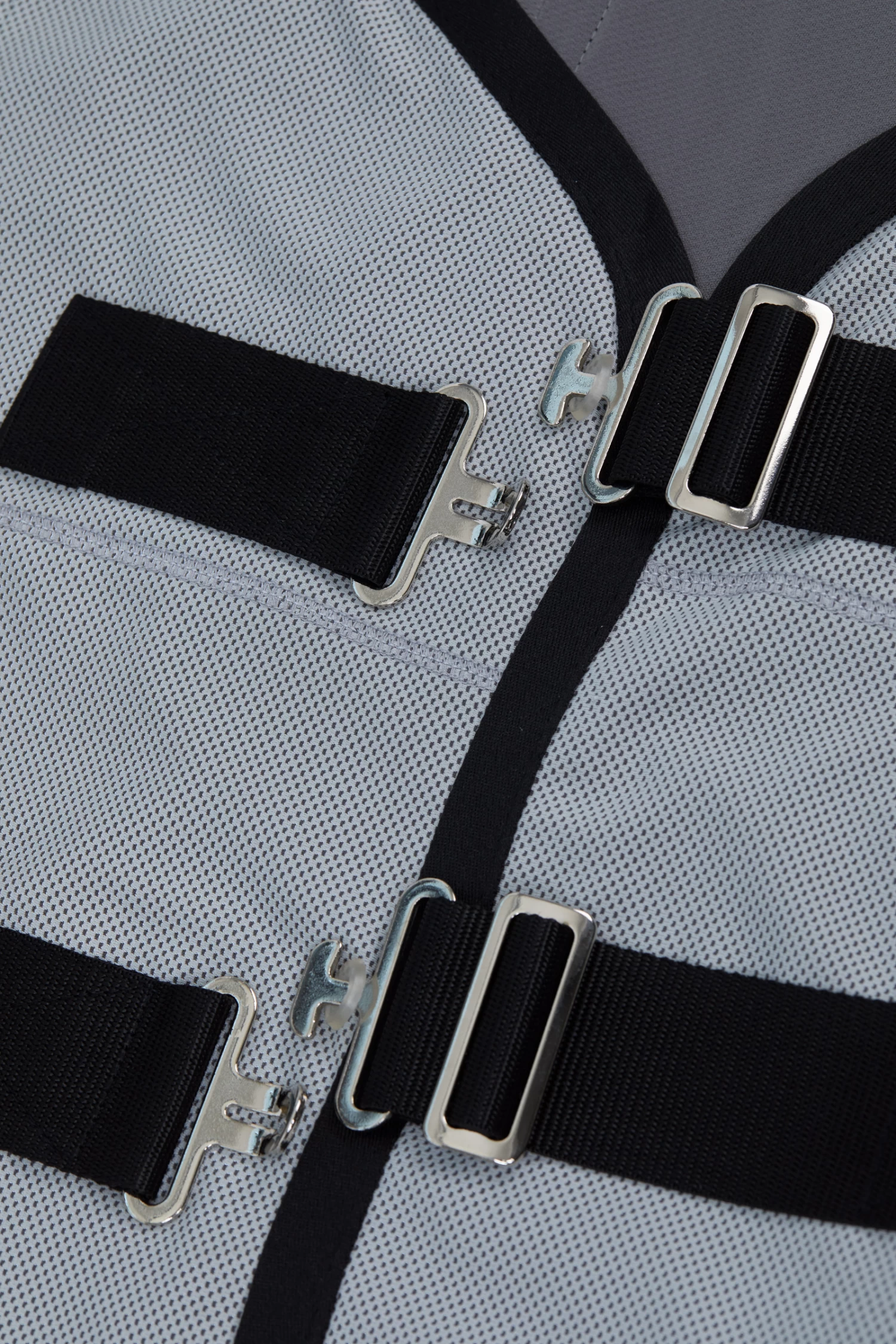 The Horze Mesh rug is made from cooling material that offers ventilation on hot days. Soft faux fur at the withers and lining at the shoulders add comfort. Double t-buckles, X-surcingles, and tail strap keep this rug in place. Logo tape along the spine adds a sporty touch.