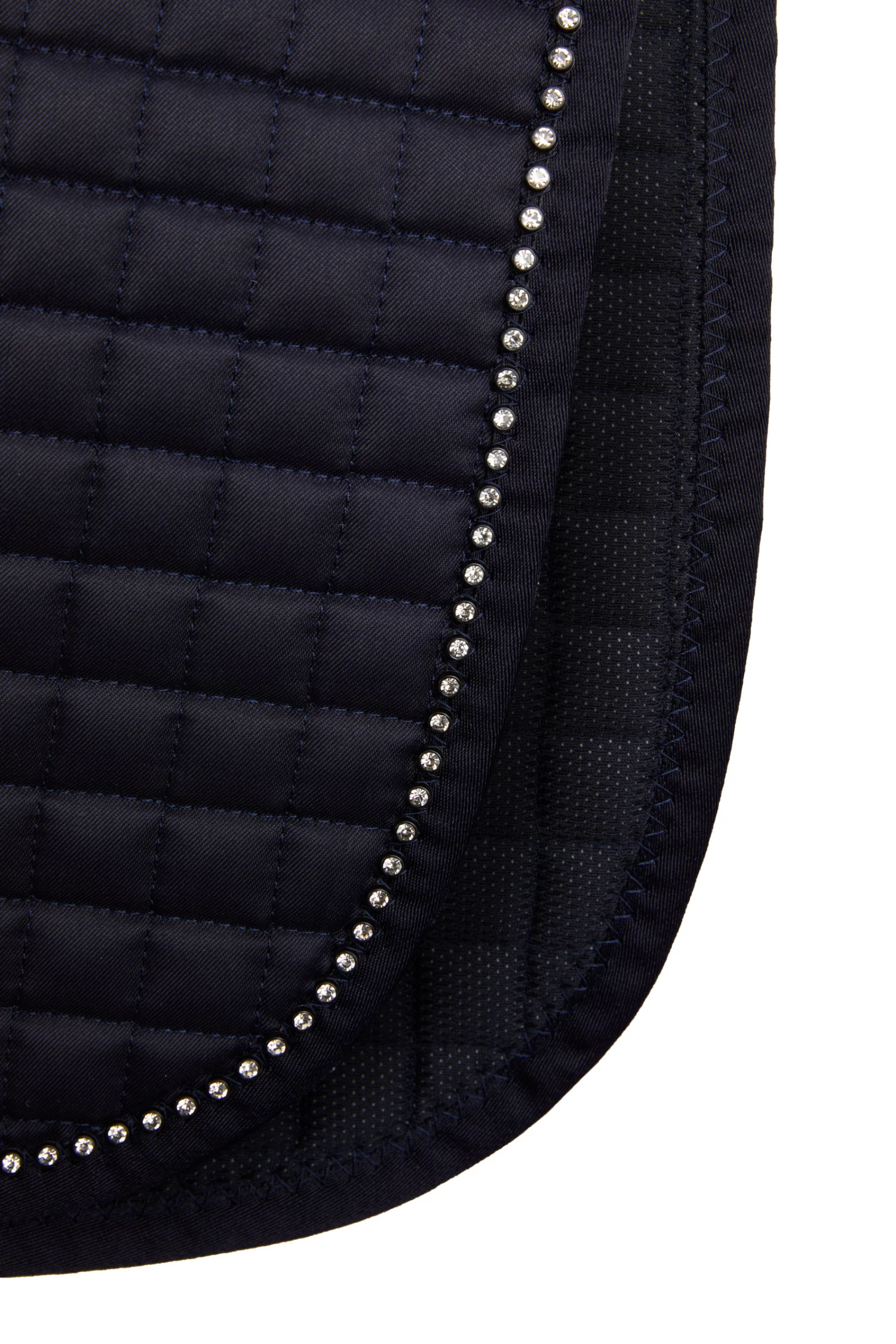 This sophisticated dressage pad with an elegant wave quilted pattern is trimmed with contrasting crystal accents for a grand appearance. A quick-dry lining keeps your horse dry and comfortable.