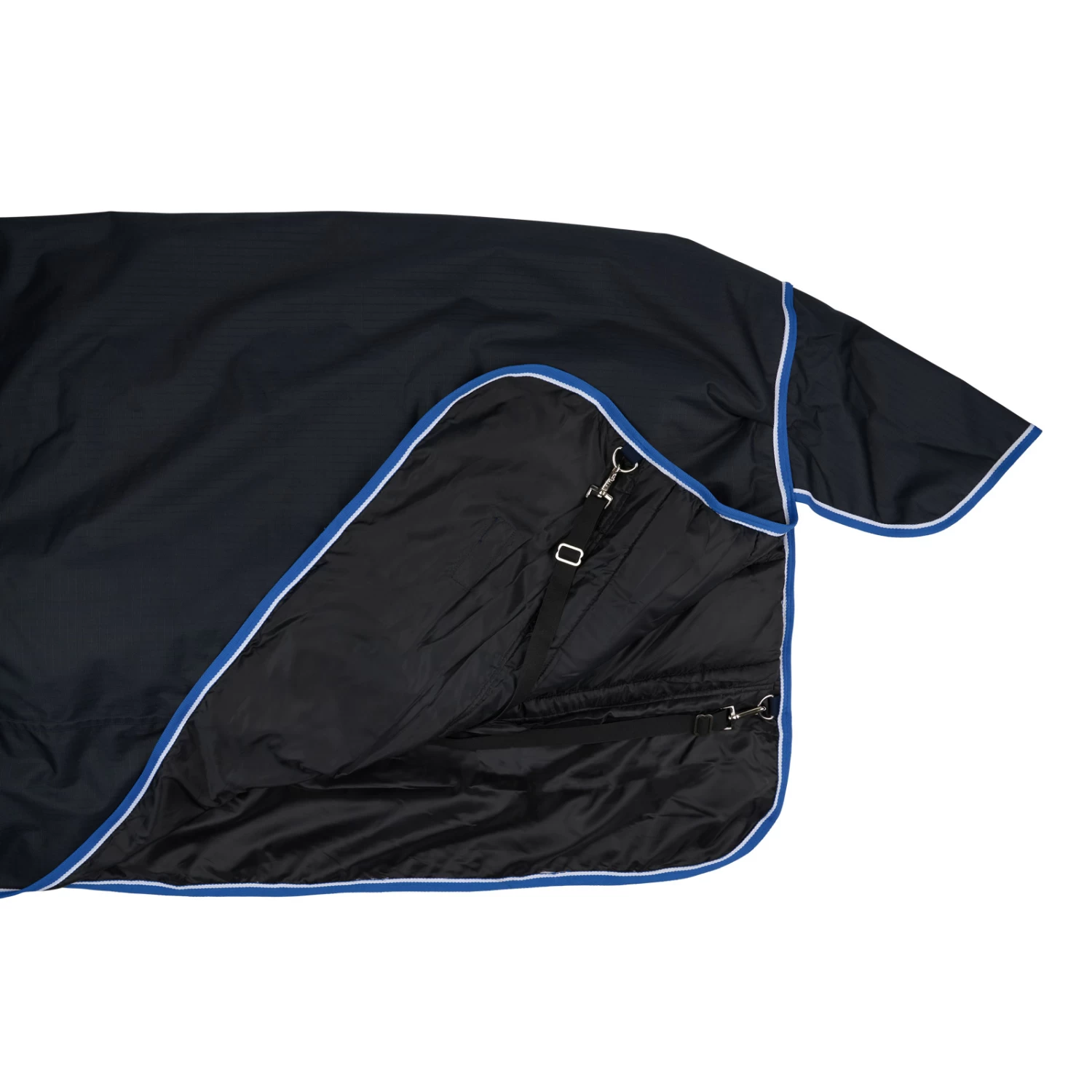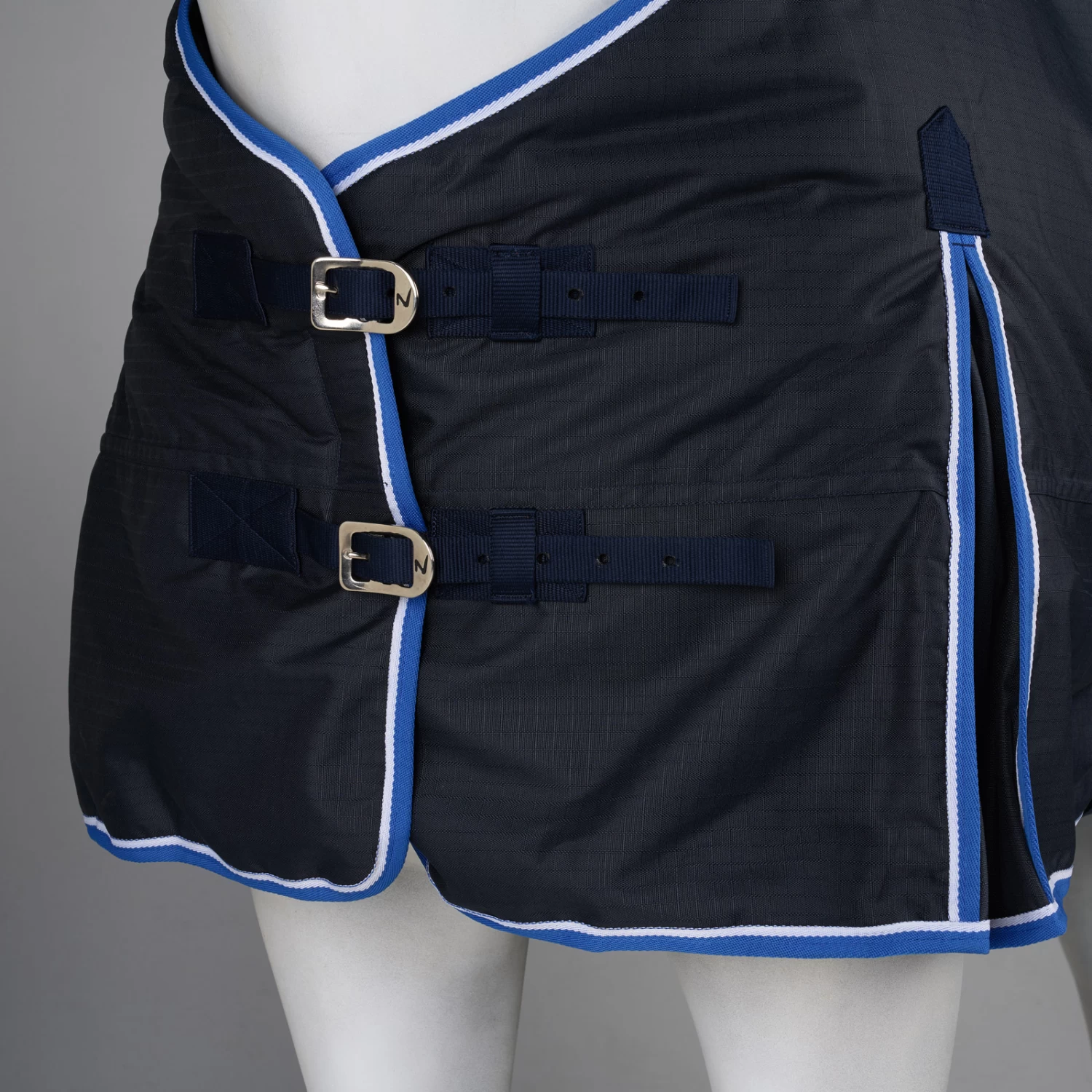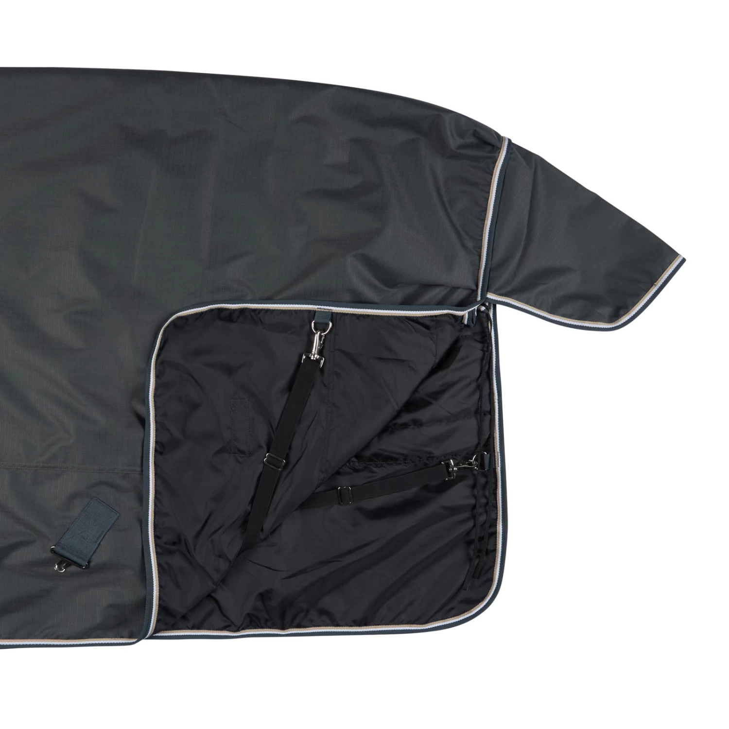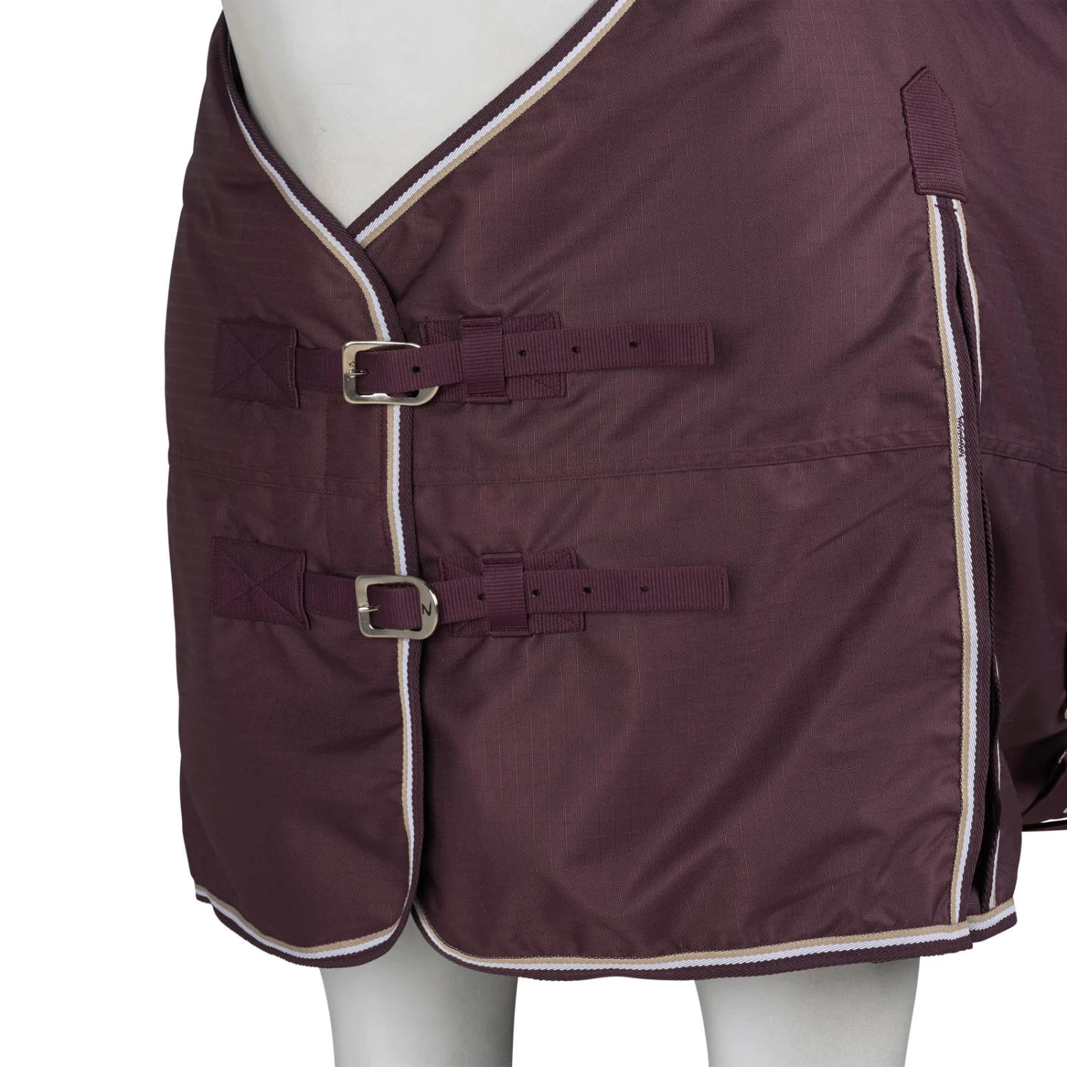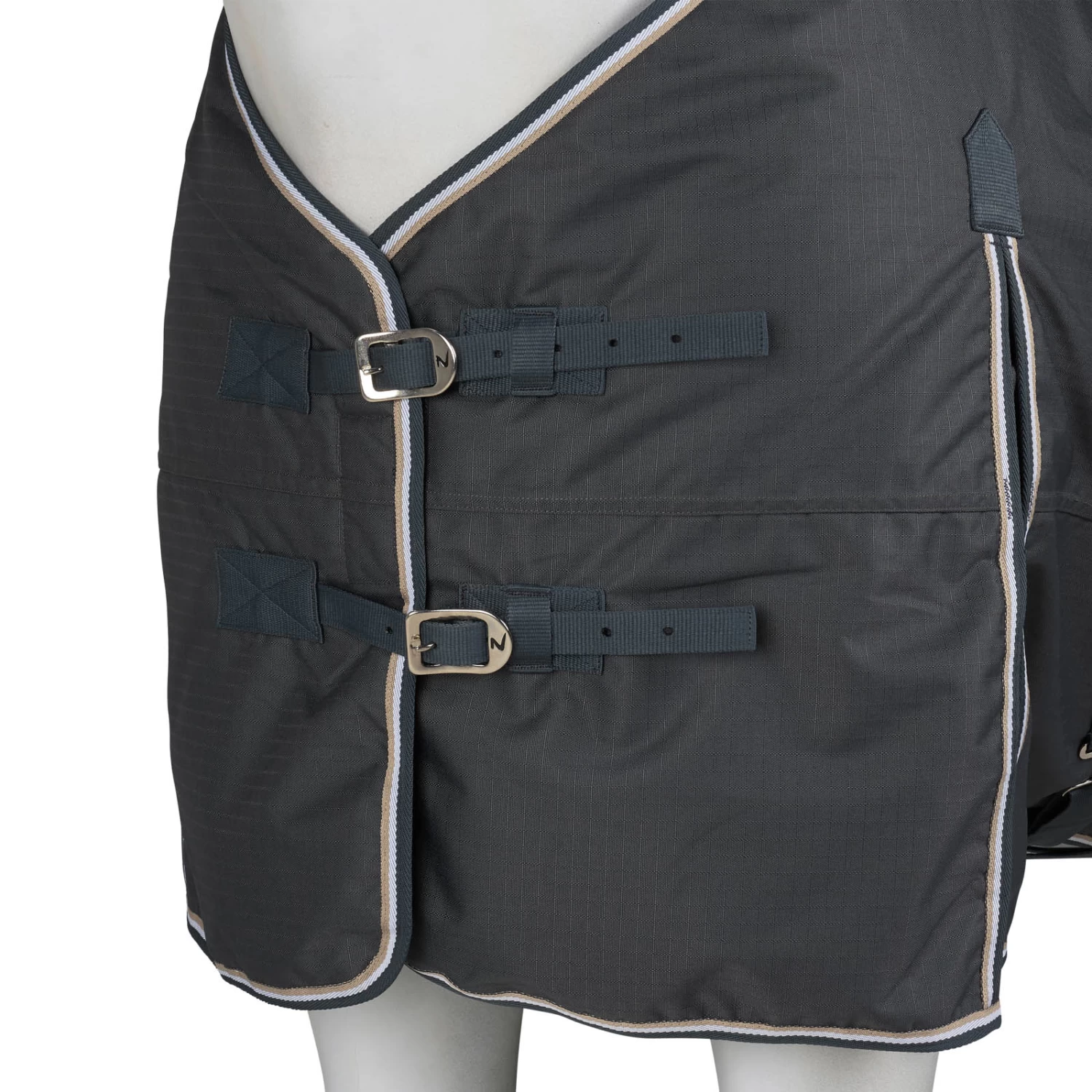 This rug is made from a waterproof, breathable fabric. The good fit at the neck and shoulder area makes it comfortable, and the high gussets allow freedom of movement. The front buckles, X-surcingles, leg straps and tail flap secure the turnout.