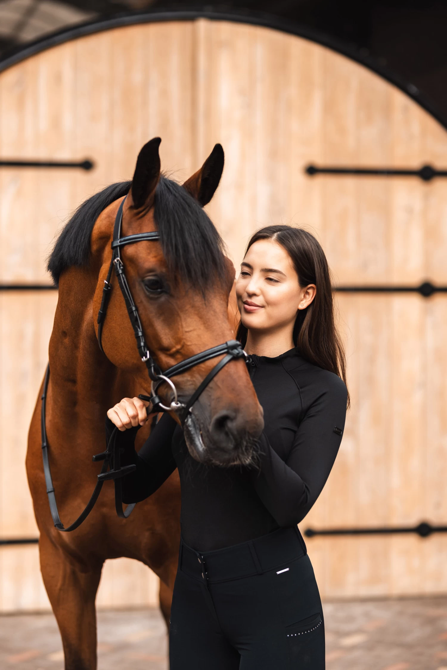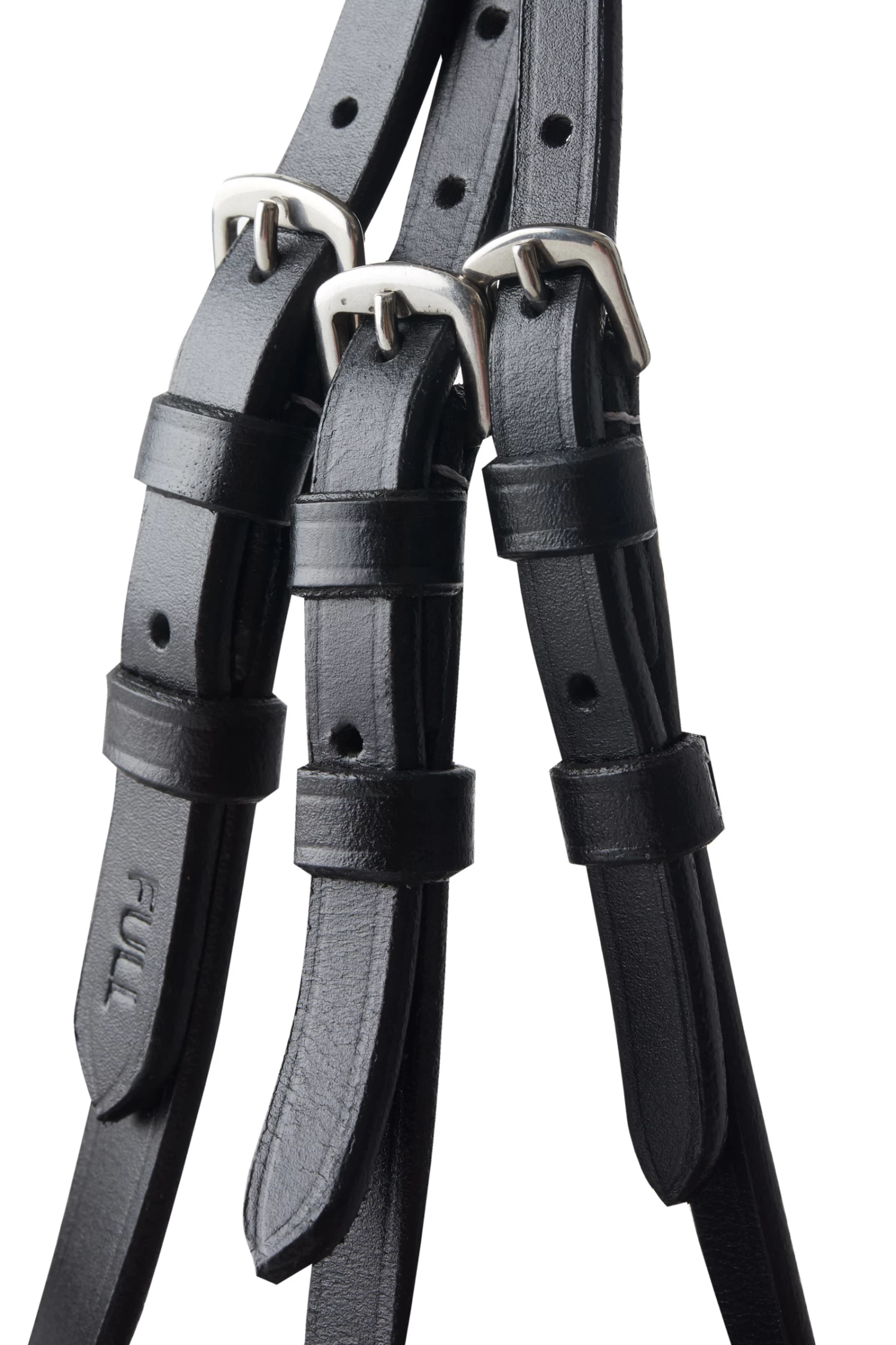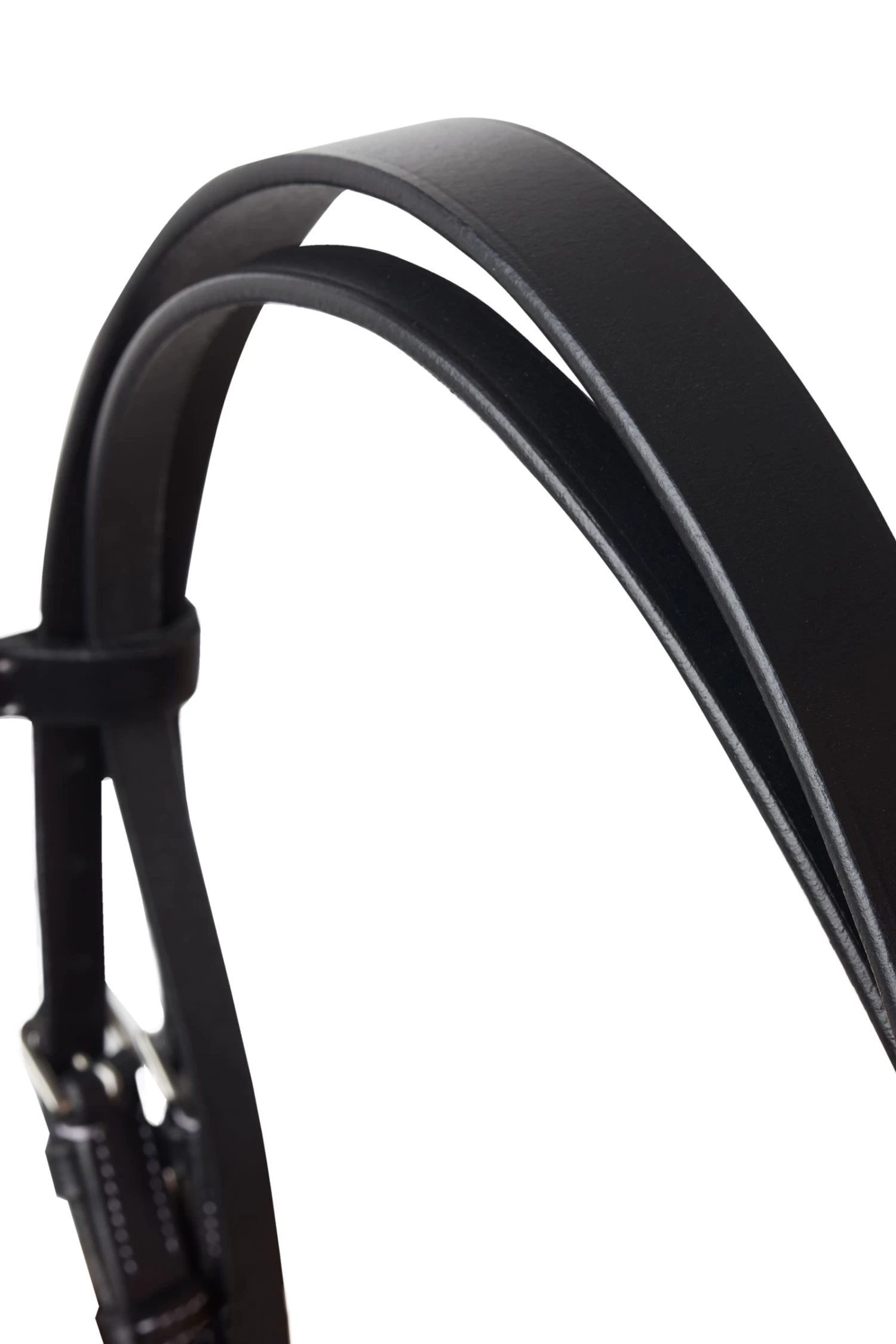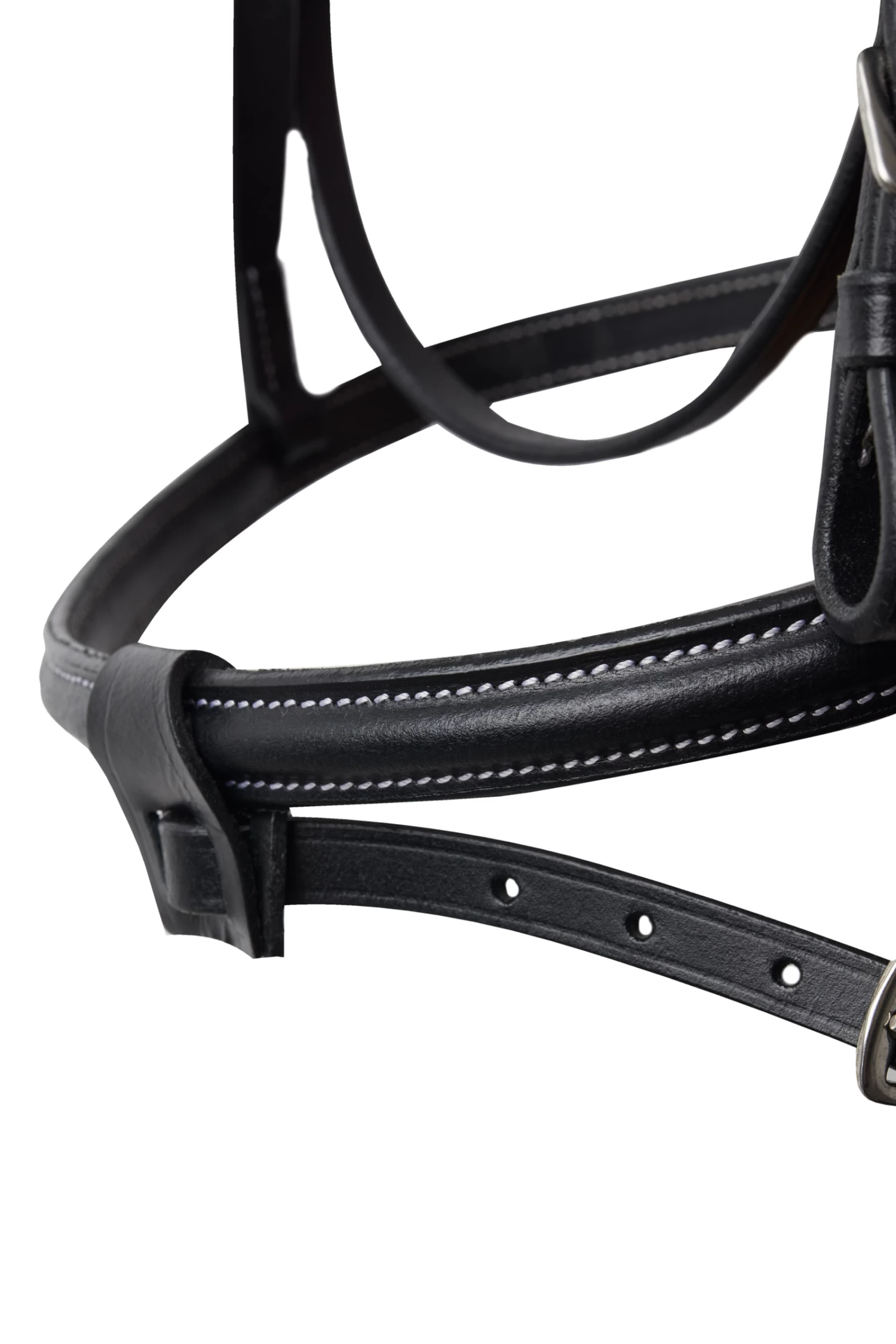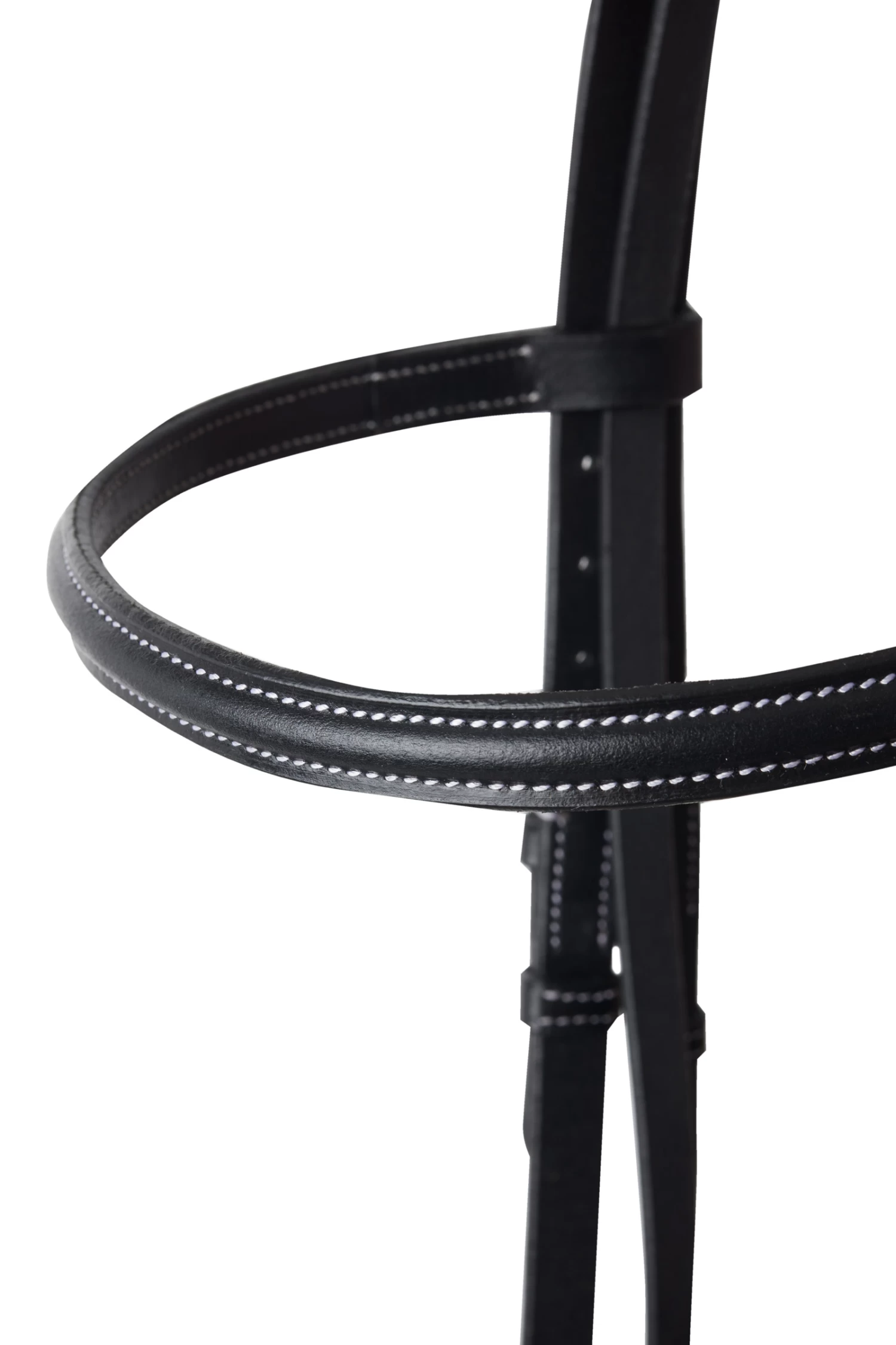 This bridle features a detachable flash strap, allowing you to customise the bridle based on your horse’s needs. The soft padding at the poll and browband ensures optimal comfort and prevents rubbing. The simple headpiece design provides a clean and elegant look. The contrast stitching adds a touch of sophistication to the overall design. The shaped browband with a logo pin adds a subtle yet eye-catching detail.
