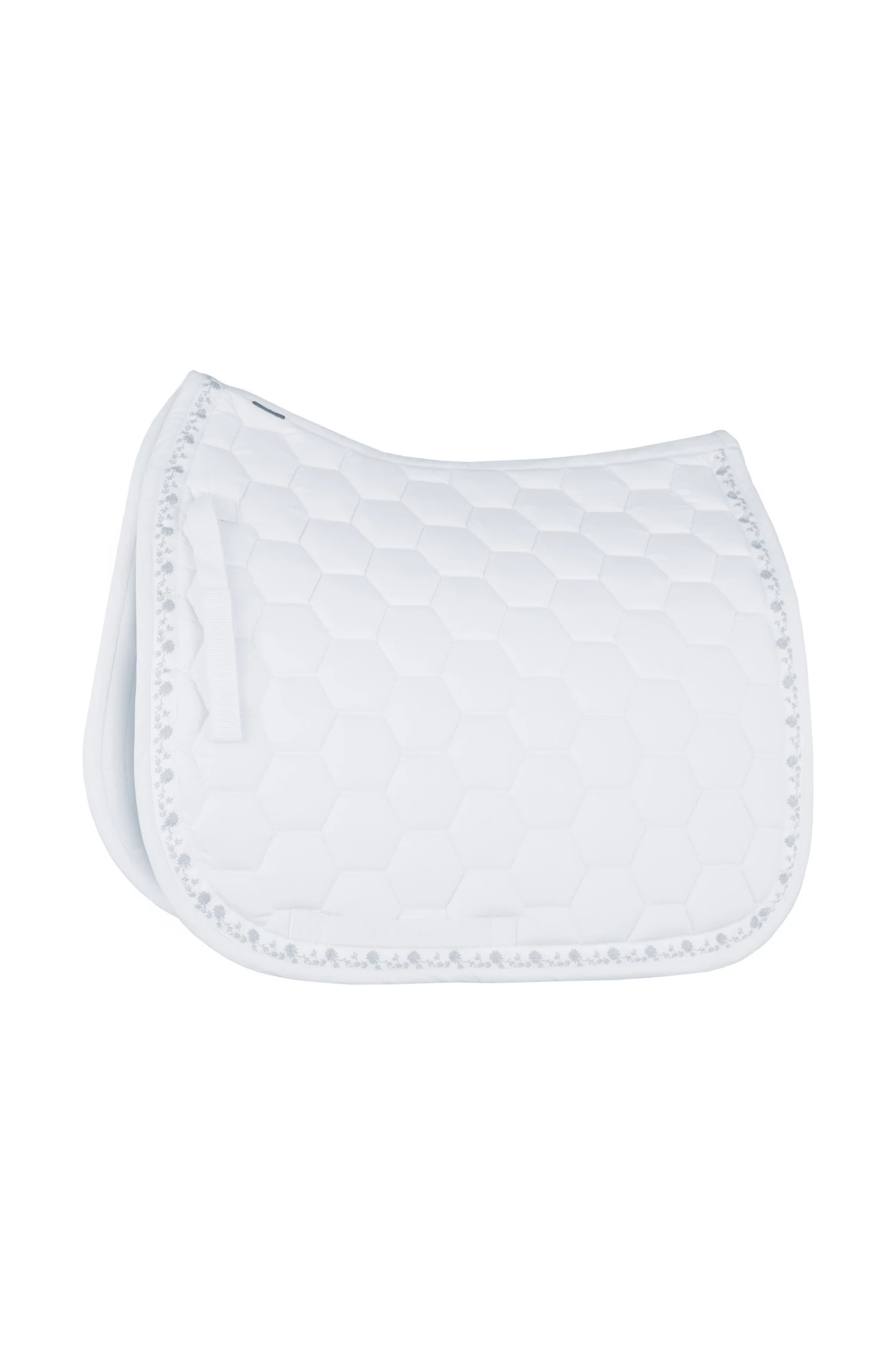 Our pretty Horze Kaitlin saddle pad is lined with cooling mesh material to keep your horse comfortable. Romb quilting provides padding beneath the saddle, and keeps it from sliding. Billet and hook-and-loop straps easily attach to your saddle. Gorgous vintage style flower piping adds the finishing touch.