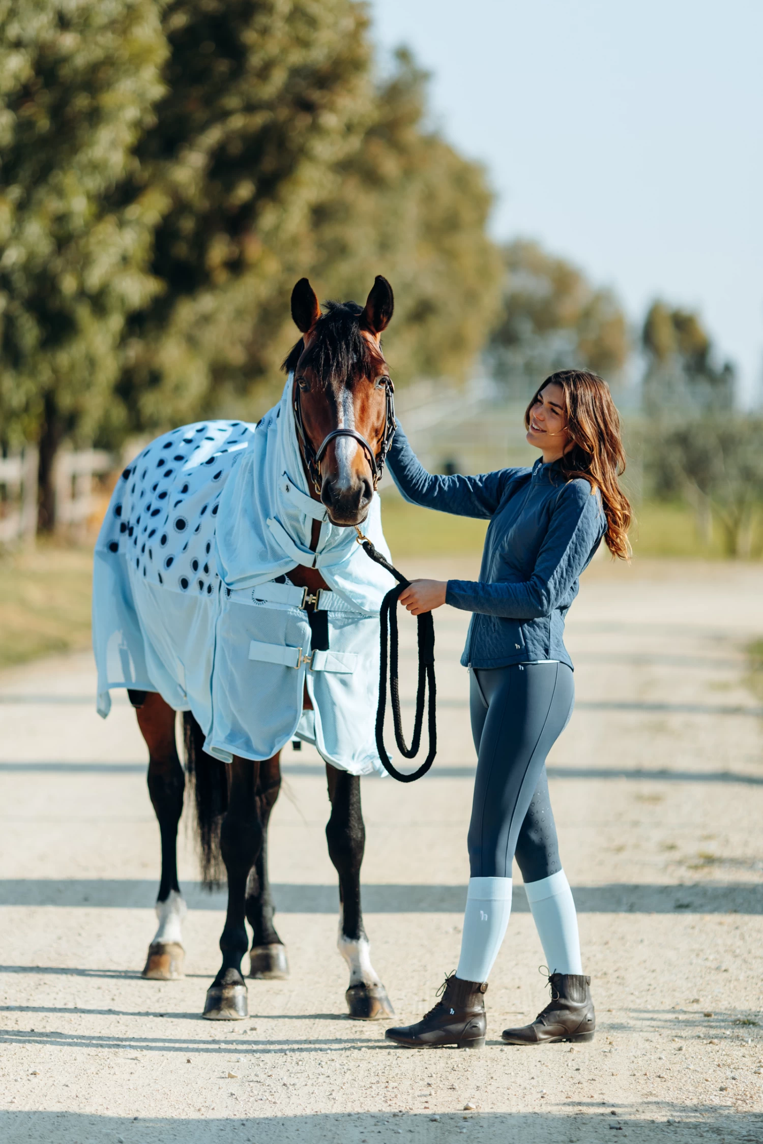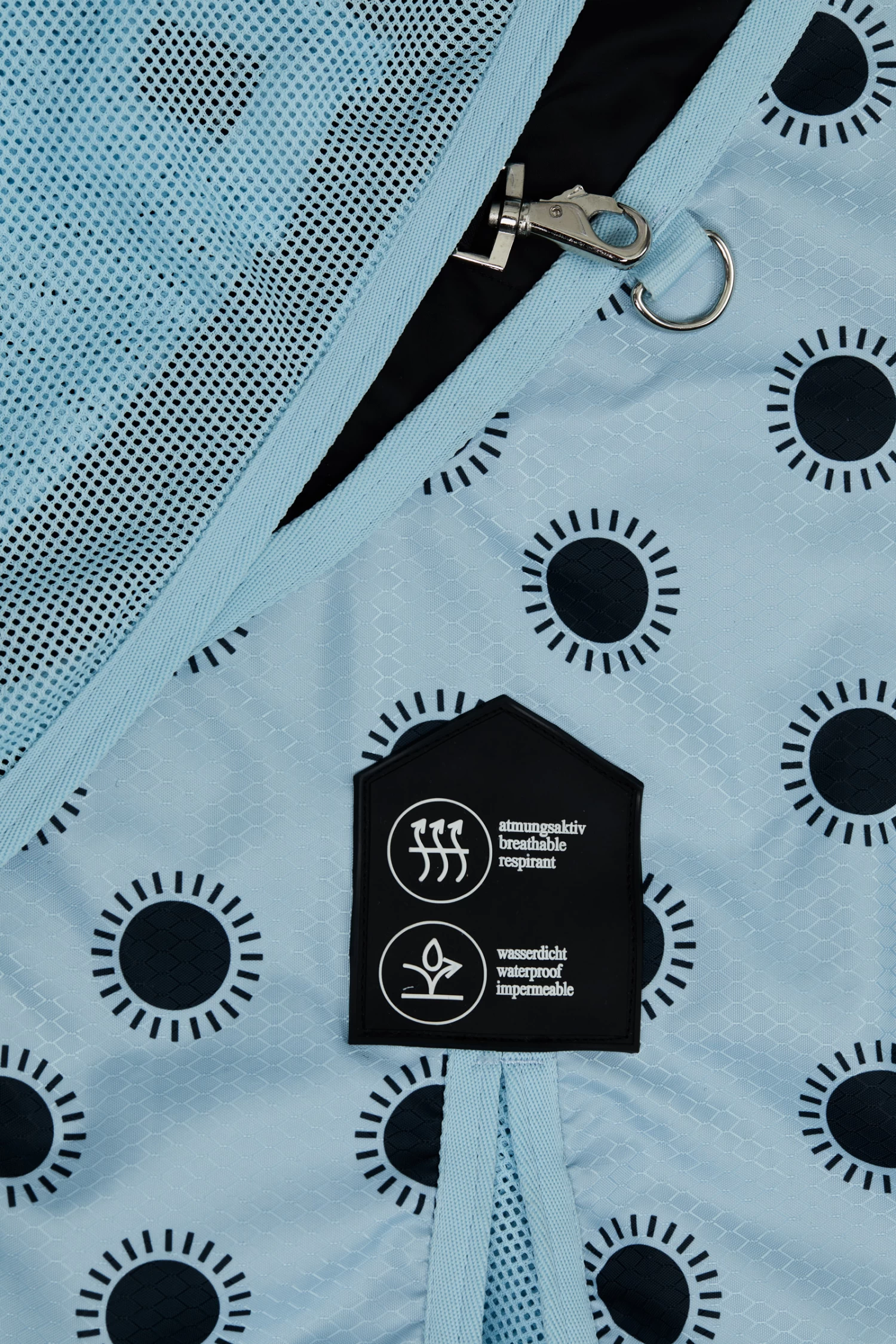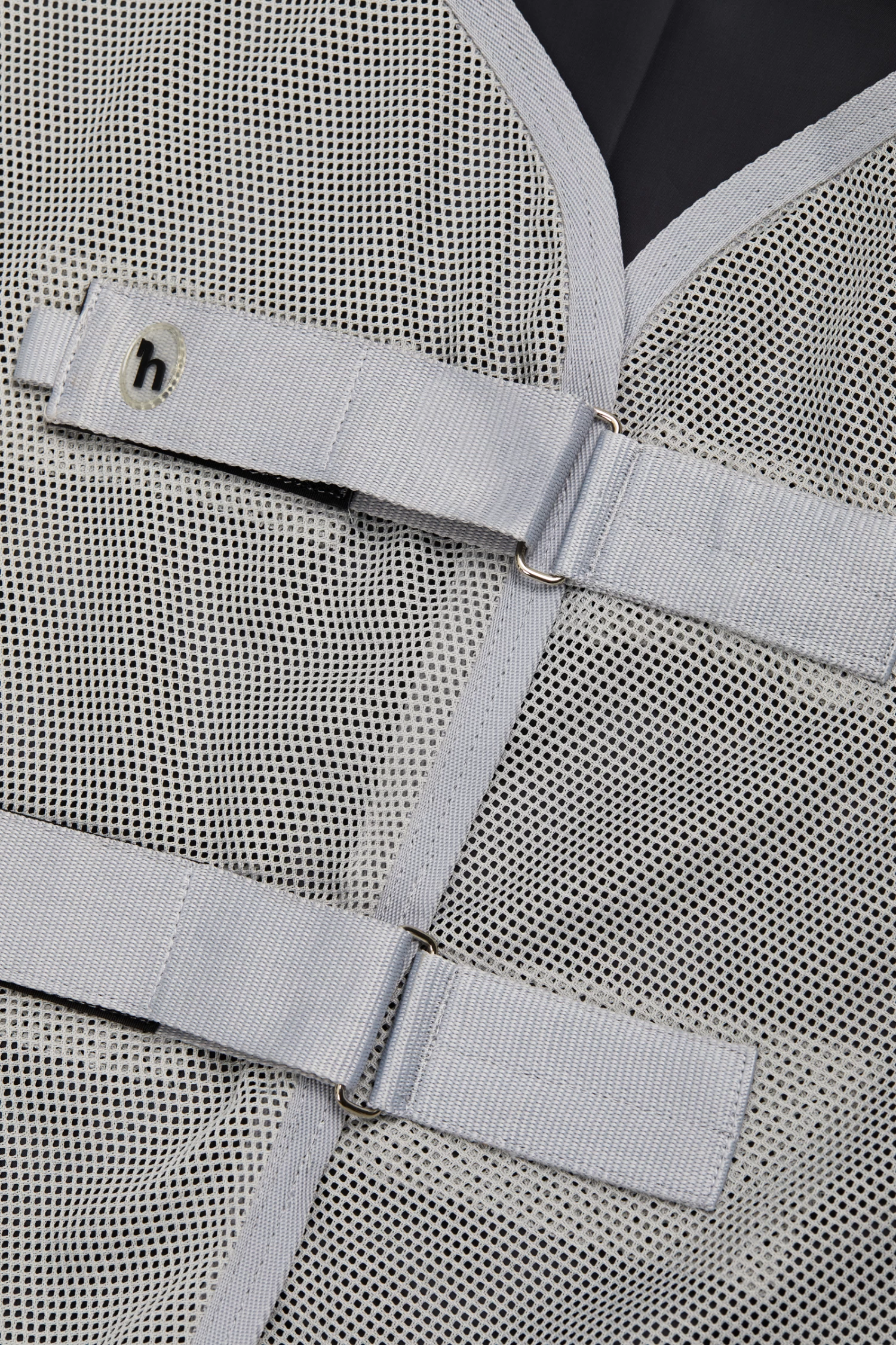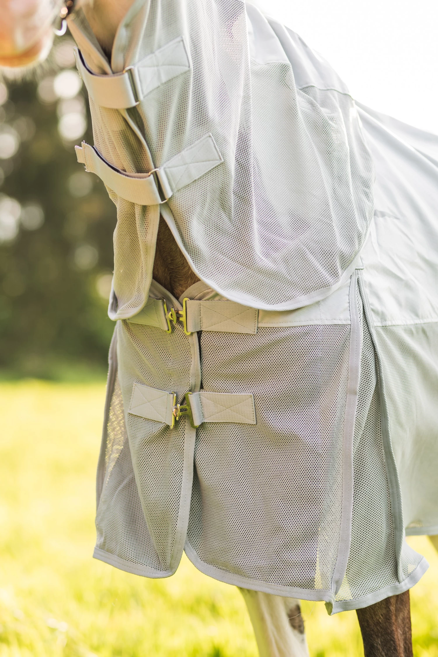 The Horze Nevada Combo rug has everything your horse will need in the summer: The upper waterproof part protects from rain while the breathable bottom part keeps flies away. Soft faux fur at the withers offers comfort. The detachable neck piece adds extra protection and breathability, and is easy to use. High gussets do not restrict your horse’s freedom of movement. Double front closure, X-surcingles and leg straps keep this rug in place.