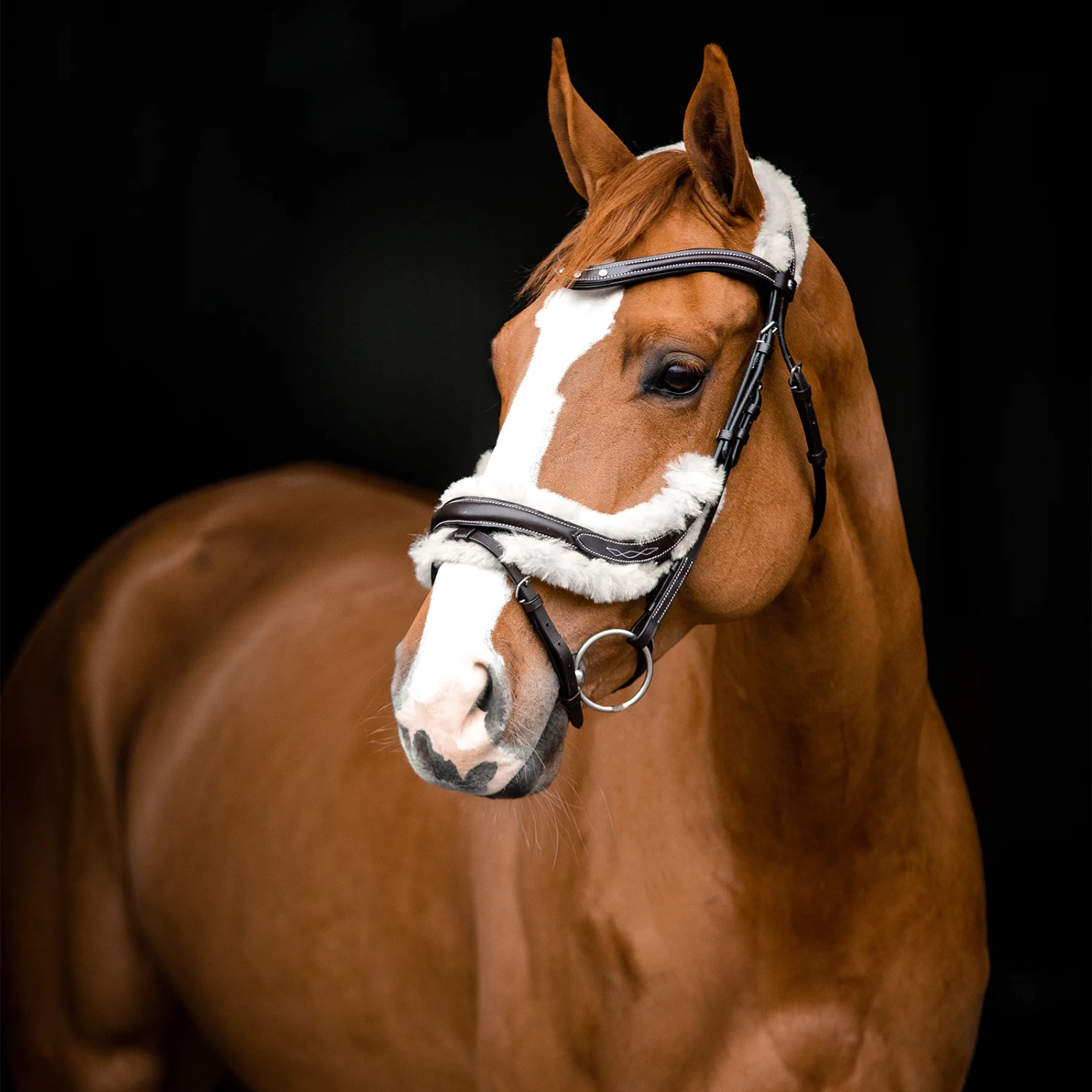 The anatomically shaped nose and crown are designed for your horse’s comfort, and adds glamour to his gear with small, glittery crystals. This bridle features two detachable linings in faux fur and super soft leather, both extremely easy to change with hook and loop fasteners. The faux fur will feel super snug against your horse’s nose. This snaffle bridle also has a flash noseband with pull-back at the chin.