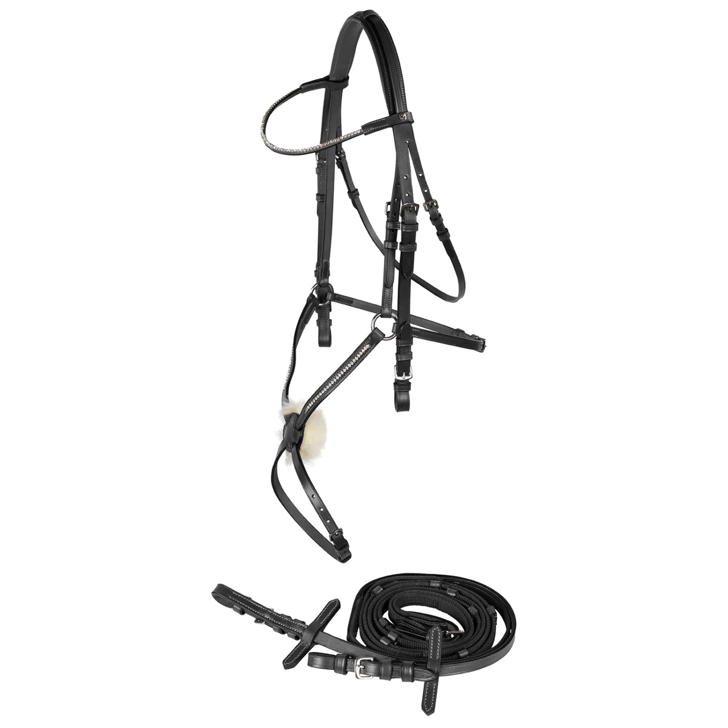 The Horze Valencia Mexican Bridle is a classic choice for cross country or jumping and this one comes with a special style. The figure-8 noseband is finished with crystals to match the straight browband for a polished look. A soft disc lined with real wool, pads the nose and won’t rub or chafe. Enjoy this elegant bridle with the matching reins.