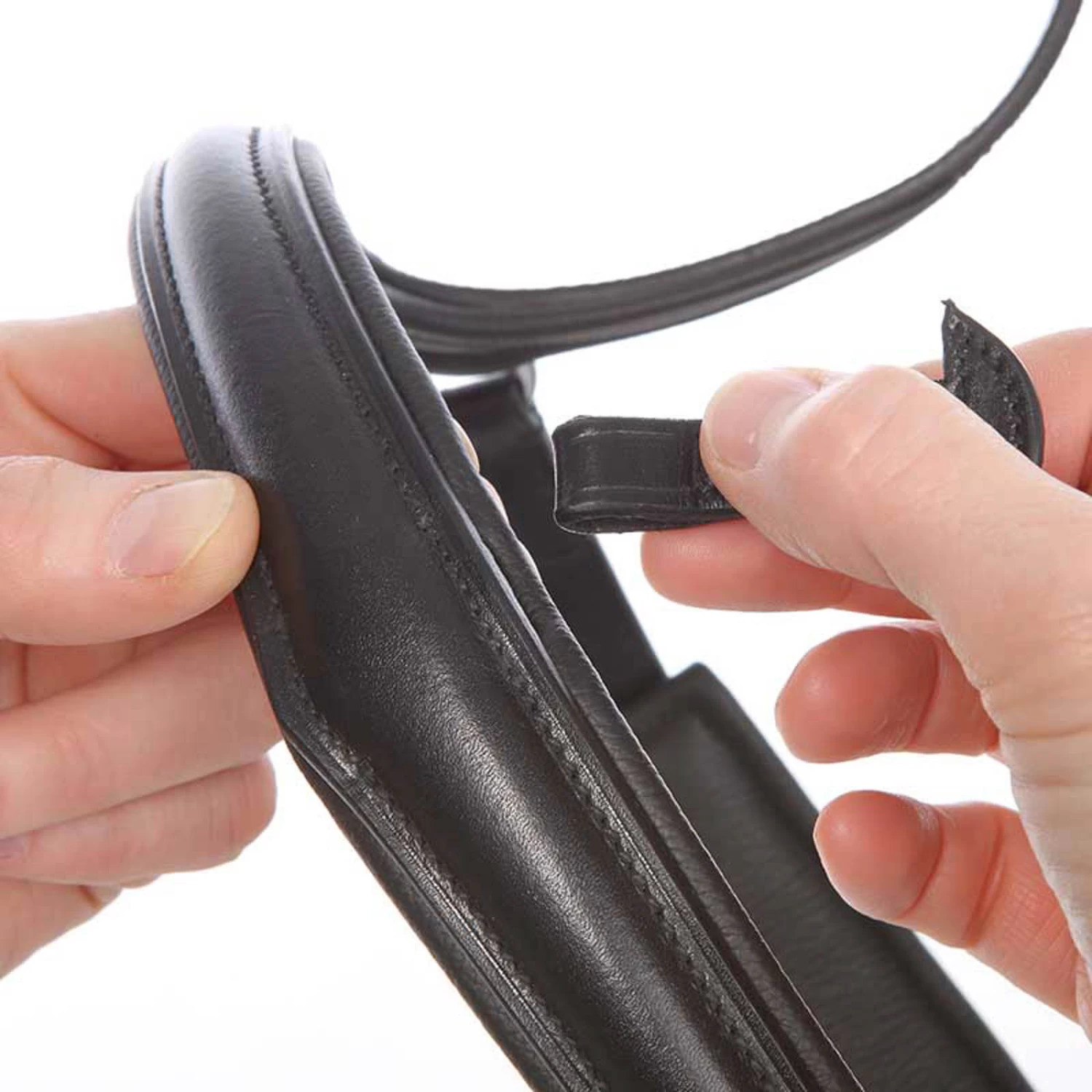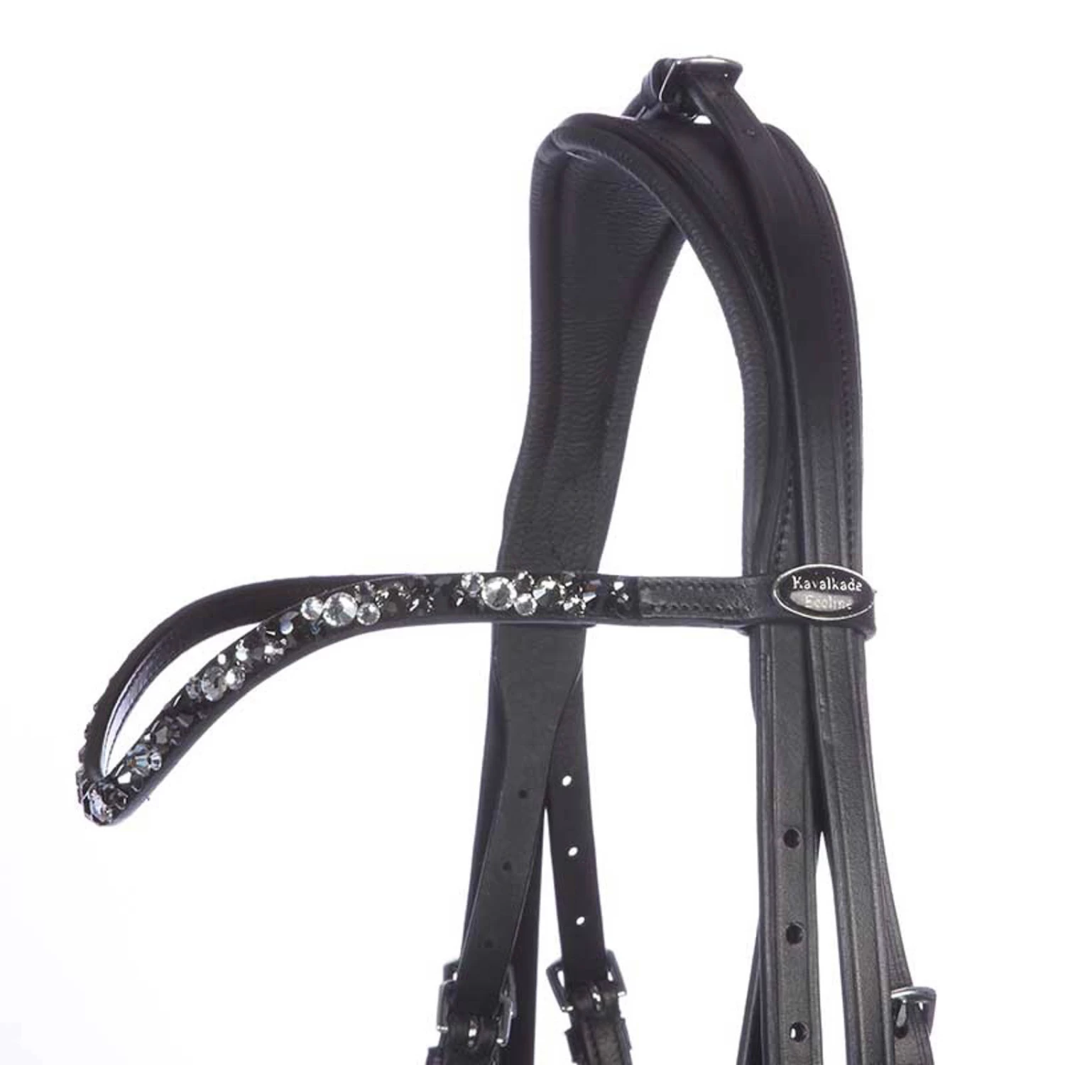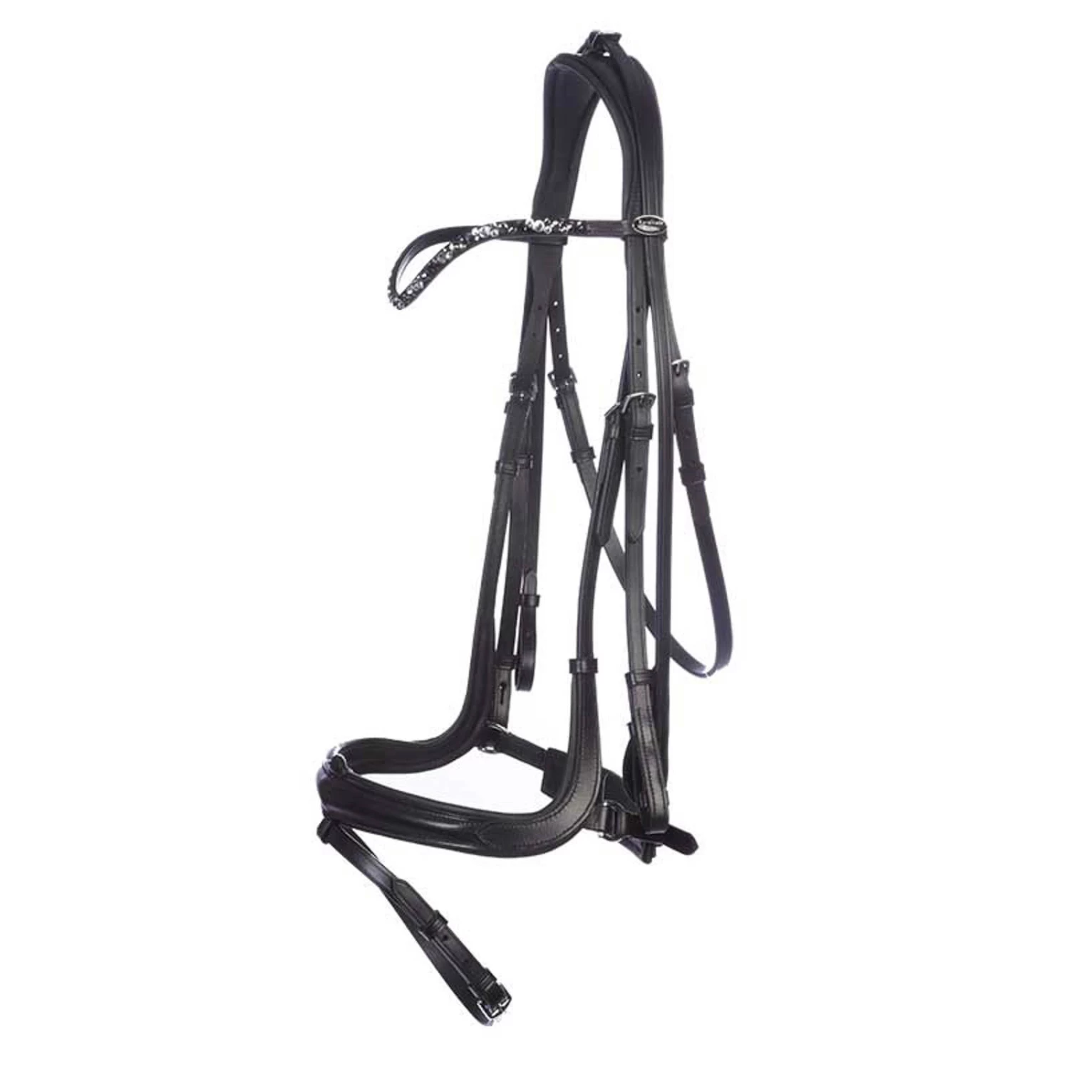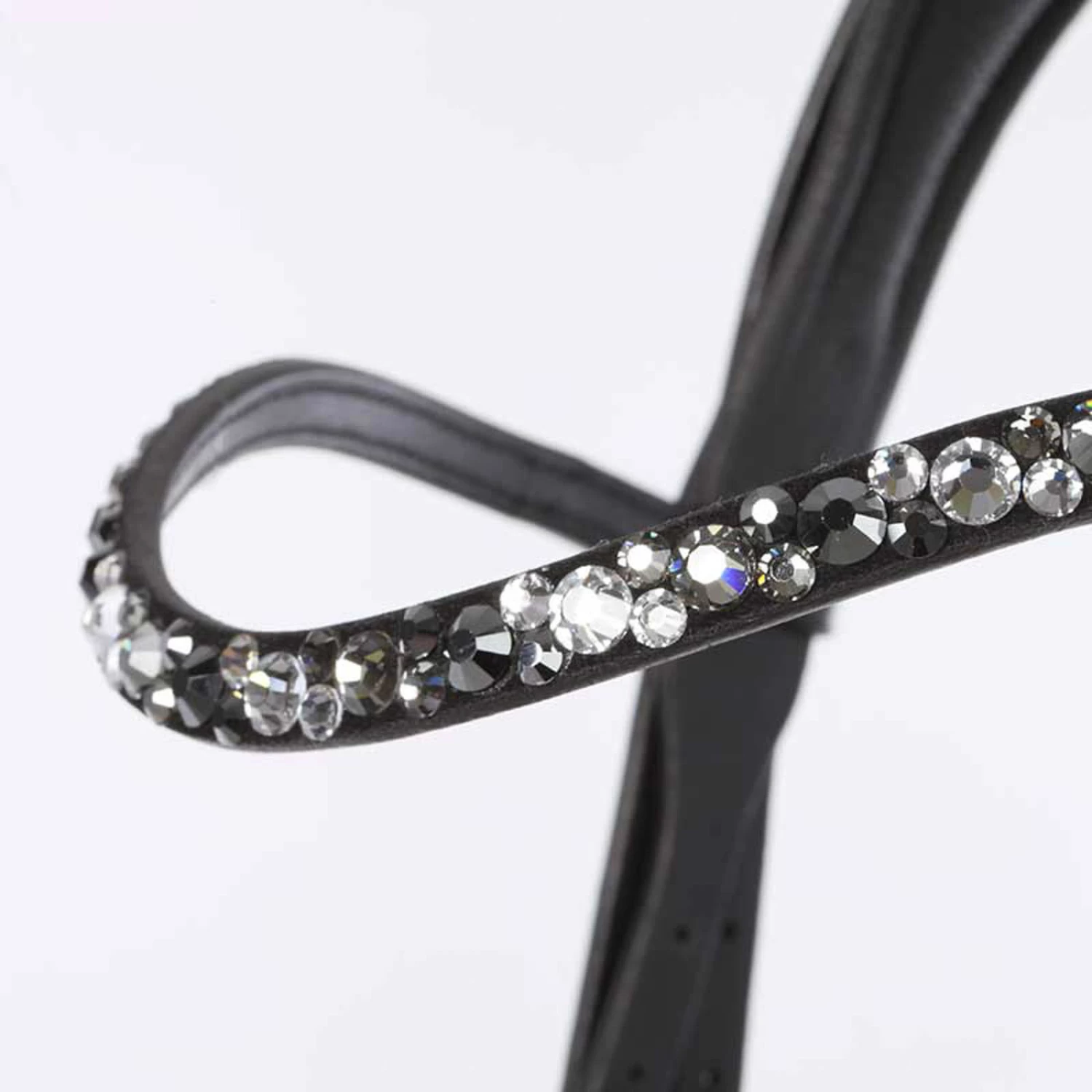 An extremely practical combination of snaffle and double bridle. With elegant browband with white, grey and black stones. Anatomically shaped English noseband with removable flash strap. Optional removable cheek pieces to convert into a double bridle. The combi bridle is also supplied with two pairs of reins. One is a normal double bridle leather rein without bars and the other is a slim rubberised rein.
