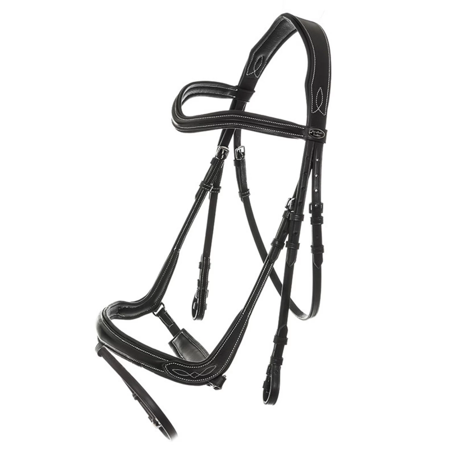 English-combined noseband, firmly sewn on both sides of the headpiece. Contrast stitching and decorative embroidery give a noble look. Noseband softly padded with special cut for even better action. Extra wide anatomically shaped headpiece provides extra ear freedom. Curved leather browband. Throat strap can be buckled on both sides. With rubberised reins.