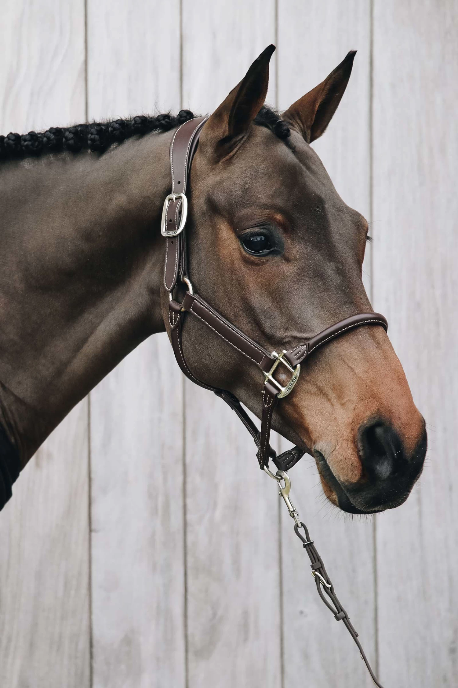 The Anatomic Leather Halter is made of artificial leather (100% animal friendly). This artificial leather does not absorb water or dirt, does not break or change colour. It’s more flexible than real leather and therefore much nicer to use. Because it doesn’t absorb water this grooming halter is perfect for washing horses. The Anatomic Halter is anatomically made and has a wider neck piece behind the ears. Therefore the pressure is divided over a larger area. The nose piece is made of rolled artificial leather. The size can be adjusted on the left and right side of the head. The Anatomic Halter features a gold coloured plate with our engraved logo. It can be turned over and personalized. All closures are gold coloured and are therefore a perfect match with are leads. The Anatomic Halter can be cleaned with our Kentucky Horsewear Tack Cleaner. It was specially developed to clean our artificial leather. Very easy and efficient! Do not clean with glycerine soap.