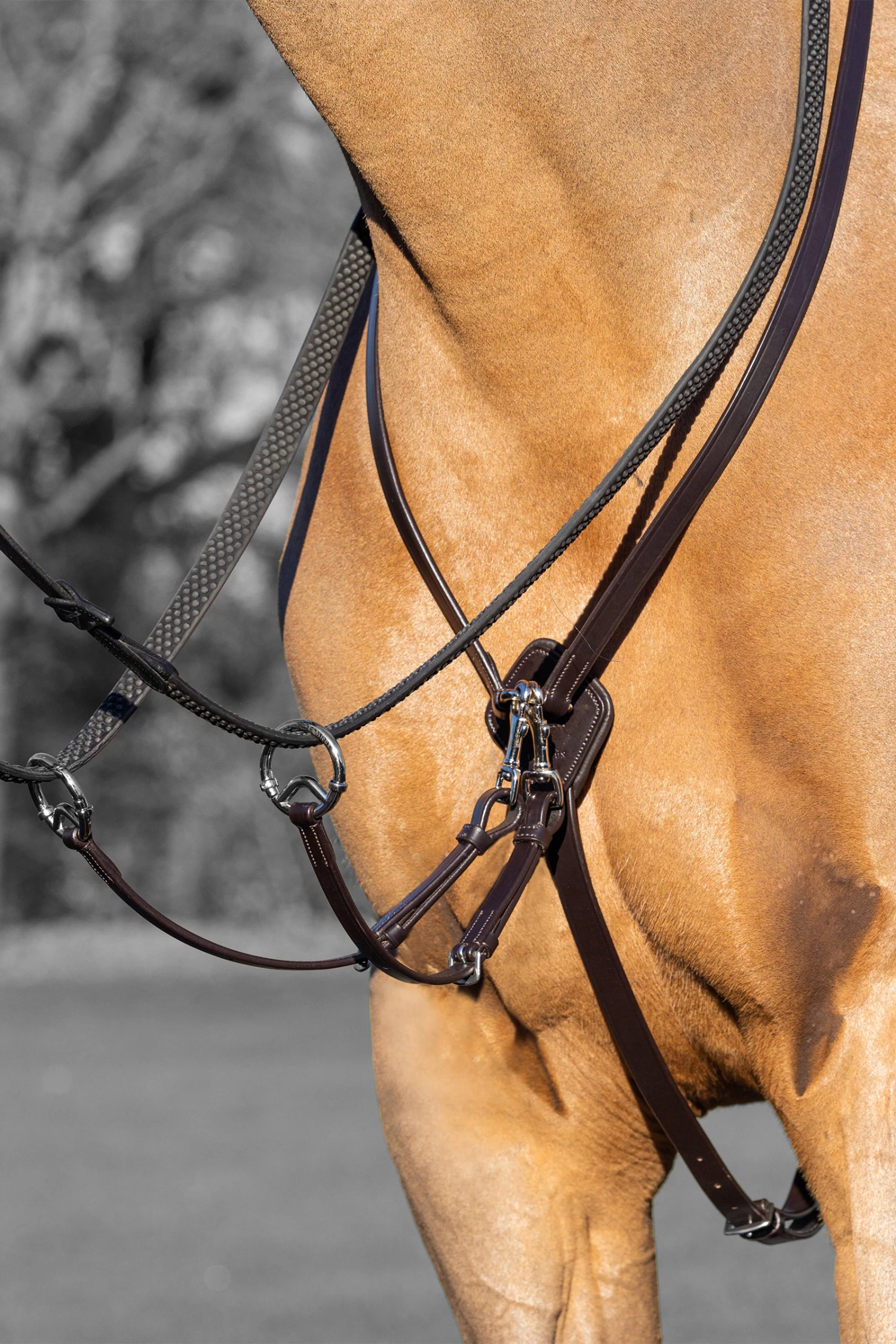 The custom-designed martingale rings clip on and off quickly and easily without having to undo the reins. Detachable rein attachments can be removed whenever they’re not needed.
