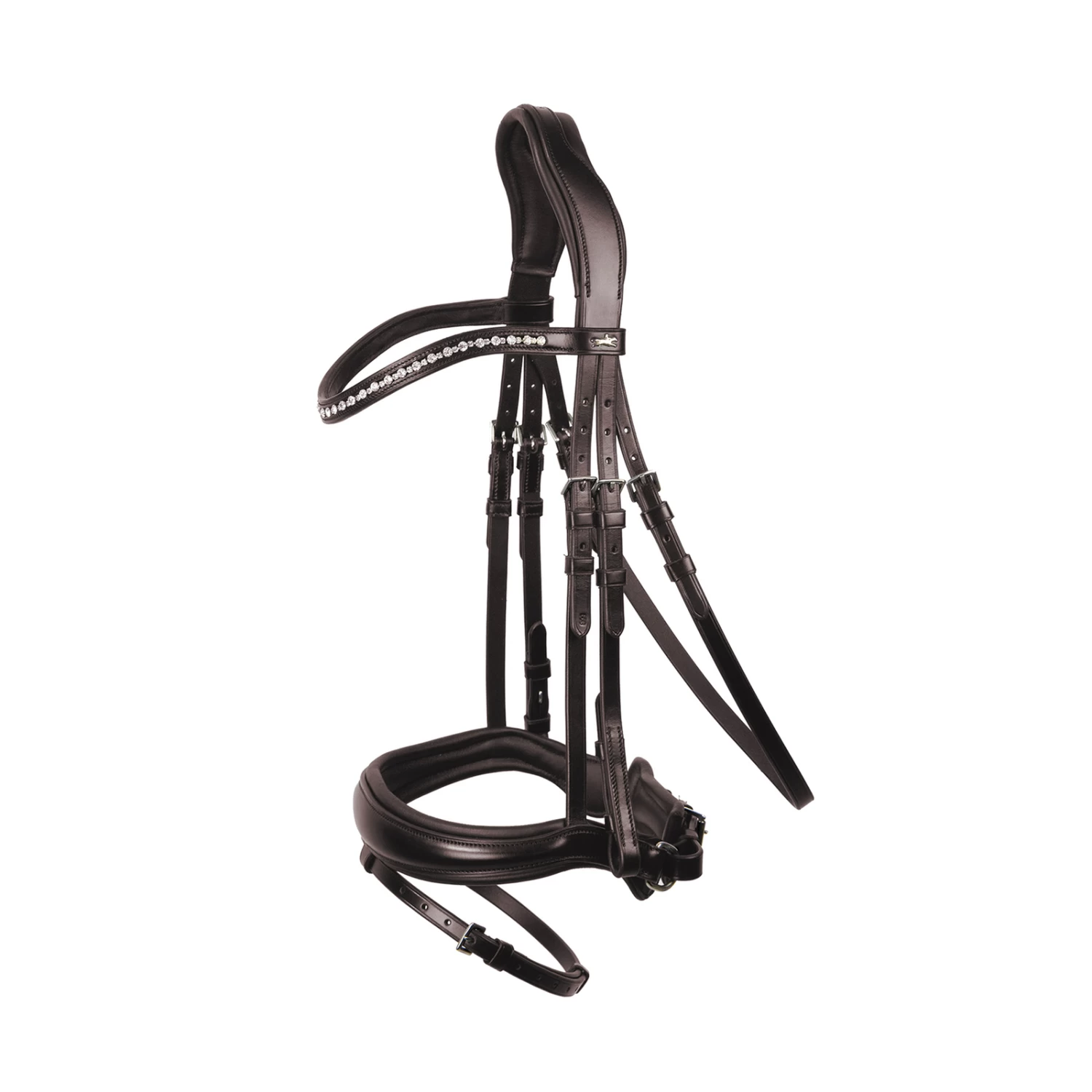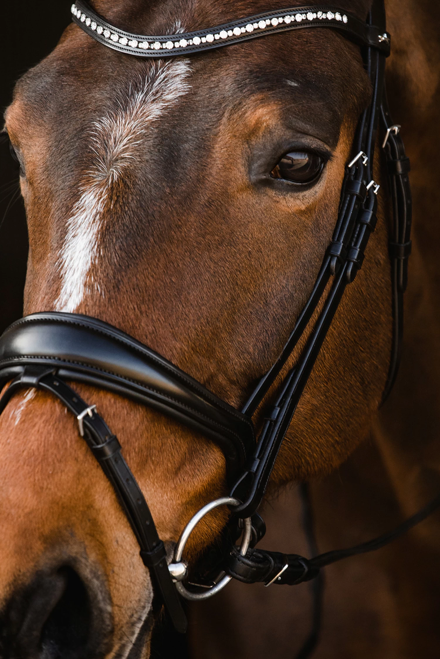 The Brantford bridle combines functionality and sporty chic. The headpiece is already familiar from the Schockemöhle Equitus line. The anatomical shape is specially adapted to the horse’s anatomy and allows extra ear freedom. The special cut of the riding halter reduces pressure on sensitive areas such as the cheekbone and the nape of the neck. Pure comfort for your horse!