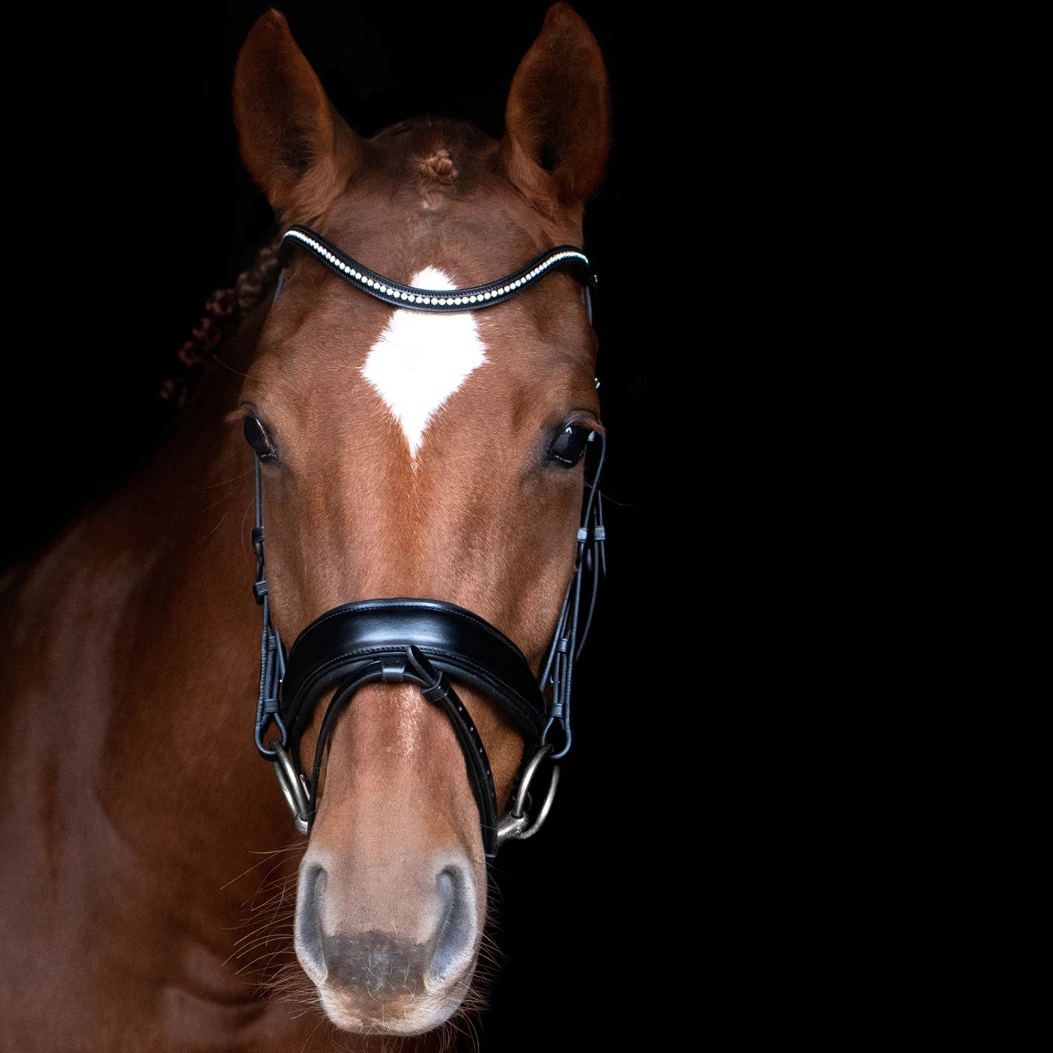 STANFORD combines functionality and sporty design: The bridle with an anatomically shaped crank noseband has a unique neck piece. This was specifically adapted to the horse’s anatomy and allows unconfined movement of the ears. Due to the reduction of pressure in sensitive areas around cheekbone and neck, the comfort of the horse is considerably enhanced. STANFORD is equipped with two browbands: one simple leather browband and one with slim crystal chain.