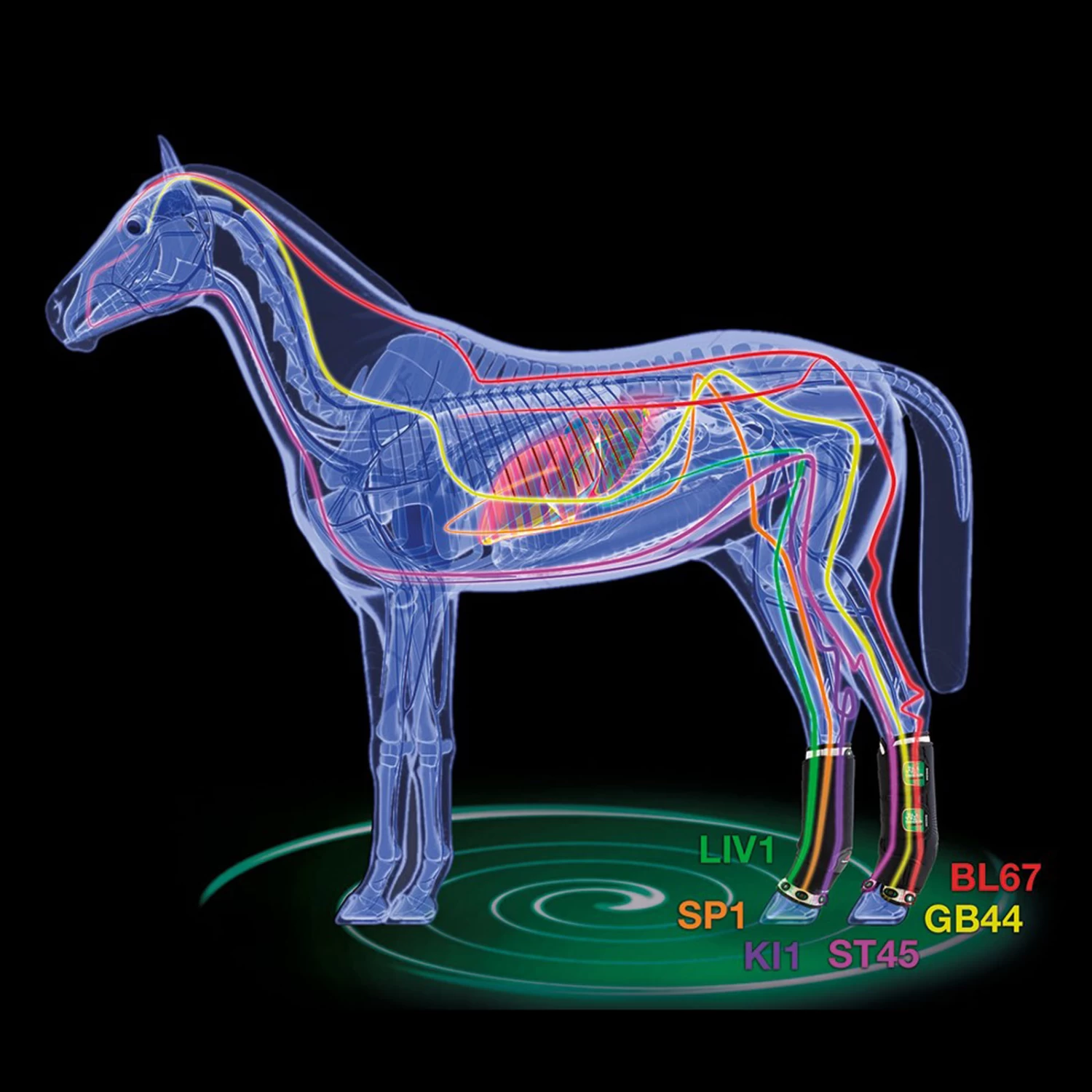 The magnet near the Yin meridian ST (Stomach – Ting ST45), acts against problems in muscles and fetlock.